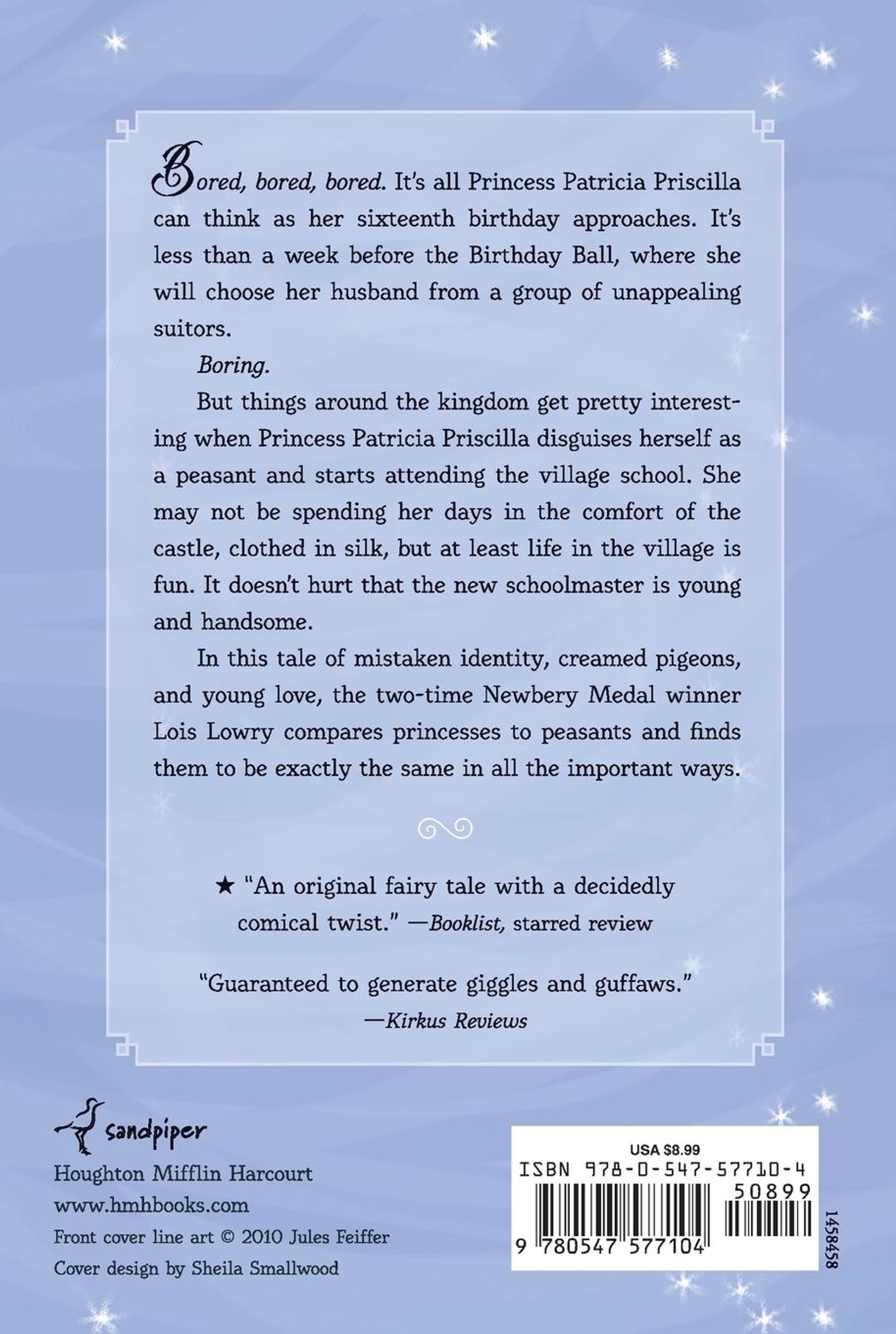 A wry, dry, laugh-out-loud princess tale by the hilarious Lois Lowry, with illustrations by Pulitzer Prize?winning cartoonist Jules Feiffer. Princess Patricia Priscilla is bored with her royal life and the excitement surrounding her sixteenth birthday ball. Doomed to endure courtship by three grotesquely unappealing noblemen, she adopts a peasant disguise and escapes her fate?for a week. In this tale of mistaken identity, creamed pigeons, and young love, the two-time Newbery medalist Lois Lowry compares princesses to peasants and finds them to be exactly the same in all the important ways.