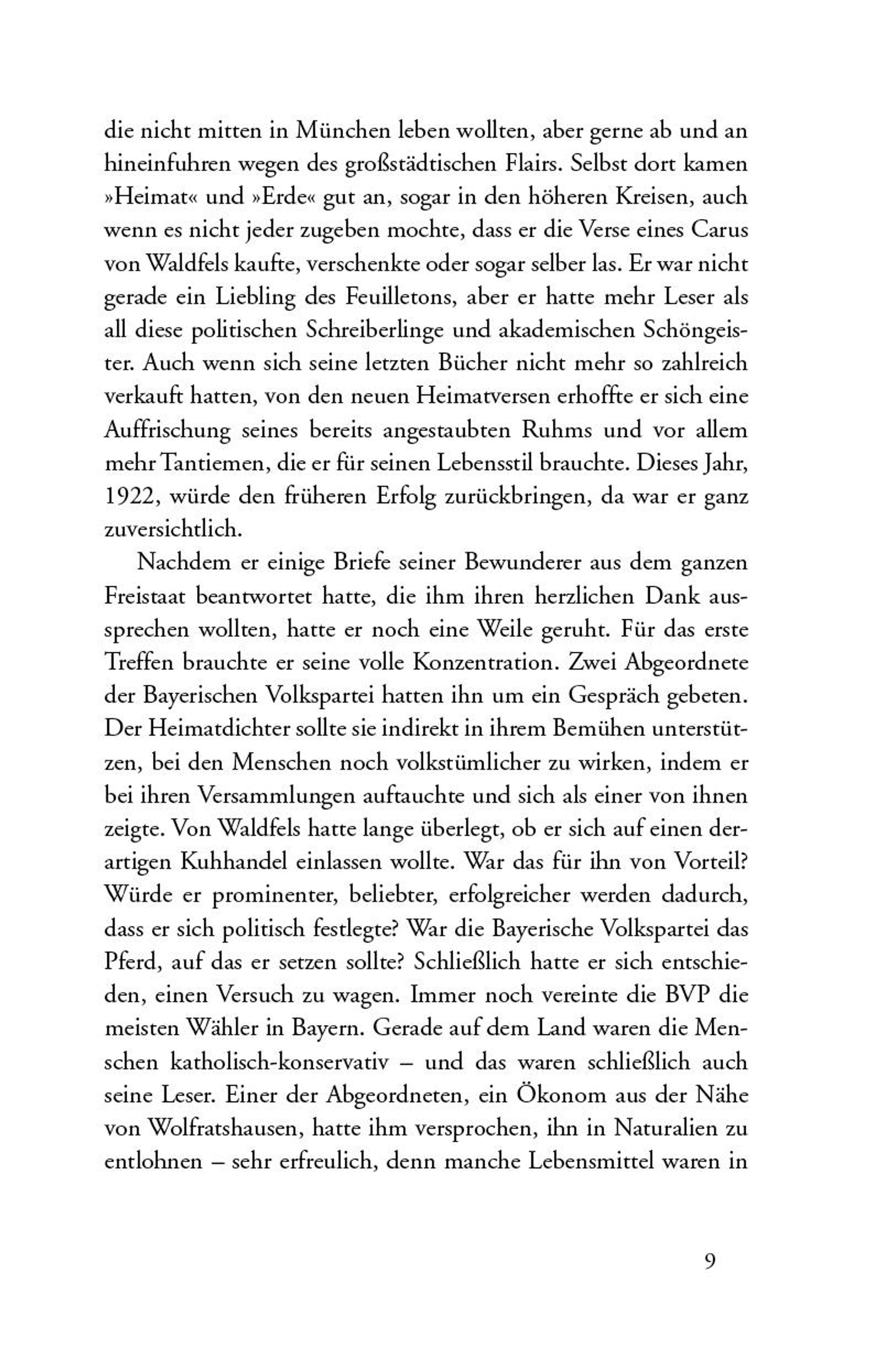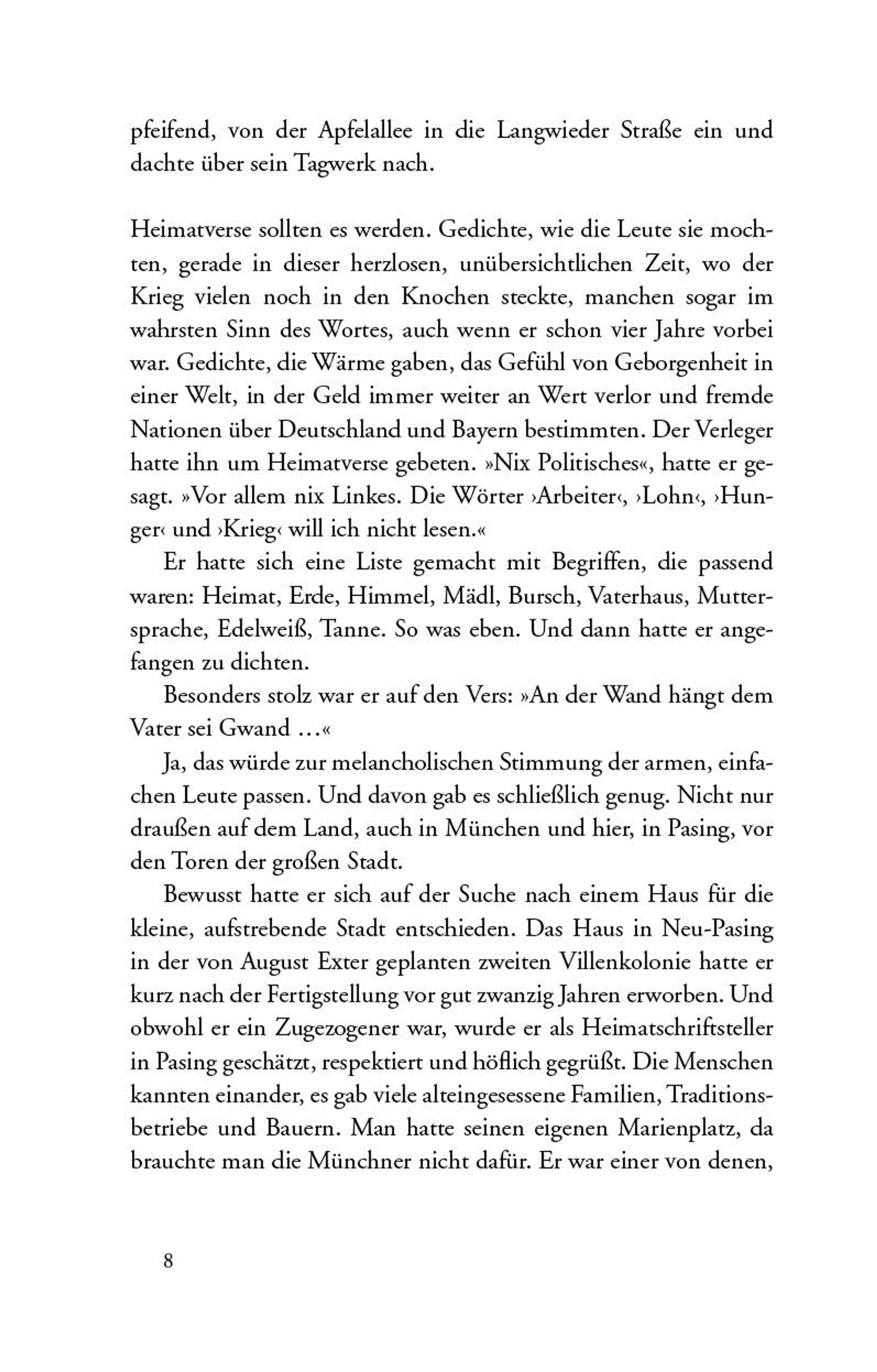 München-Pasing, 1922: Ein Heimatdichter wird ermordet, und ein junger Schreiner muss dafür ins Gefängnis, obwohl die Verdachtsmomente alles andere als schlüssig sind. Seine Frau Agnes tut alles, um die Unschuld ihres Mannes zu beweisen. Vorübergehend muss sie sogar ihre beiden Kinder in die Obhut Fremder geben. Ein zweiter Mord geschieht; der Ermordete hat die gleiche seltsame Wunde am Kopf wie das erste Opfer. Oberkommissar Benedikt Wurzer steht vor einem Rätsel, bis ihn ein Hinweis in die Oberpfalz führt und er ahnt, dass ein weiterer Mord unmittelbar bevorsteht ... Ein spannender und berührender Kriminalroman aus der Zeit zwischen den Kriegen, als die politischen Kämpfe zwischen Rechts und Links schärfer wurden und das Geld nichts mehr wert war, als die Menschen vom Land in der Stadt ihre Zukunft suchten und doch von ihrem Schicksal eingeholt wurden.