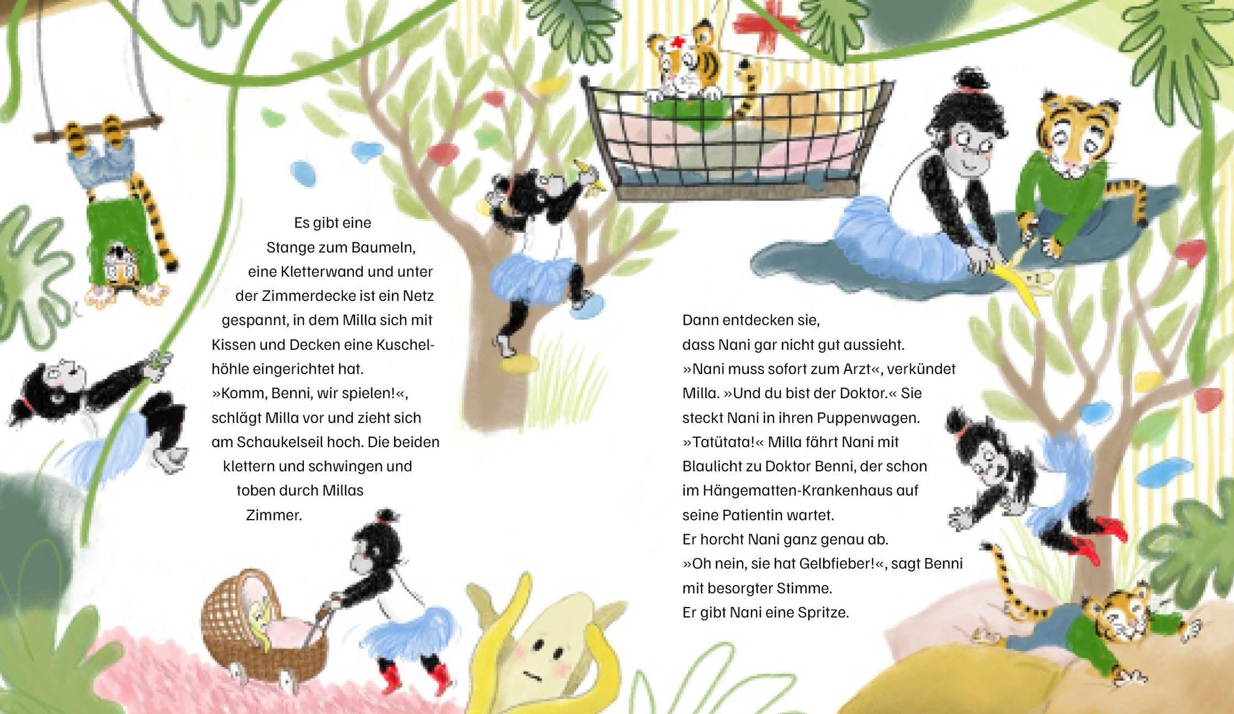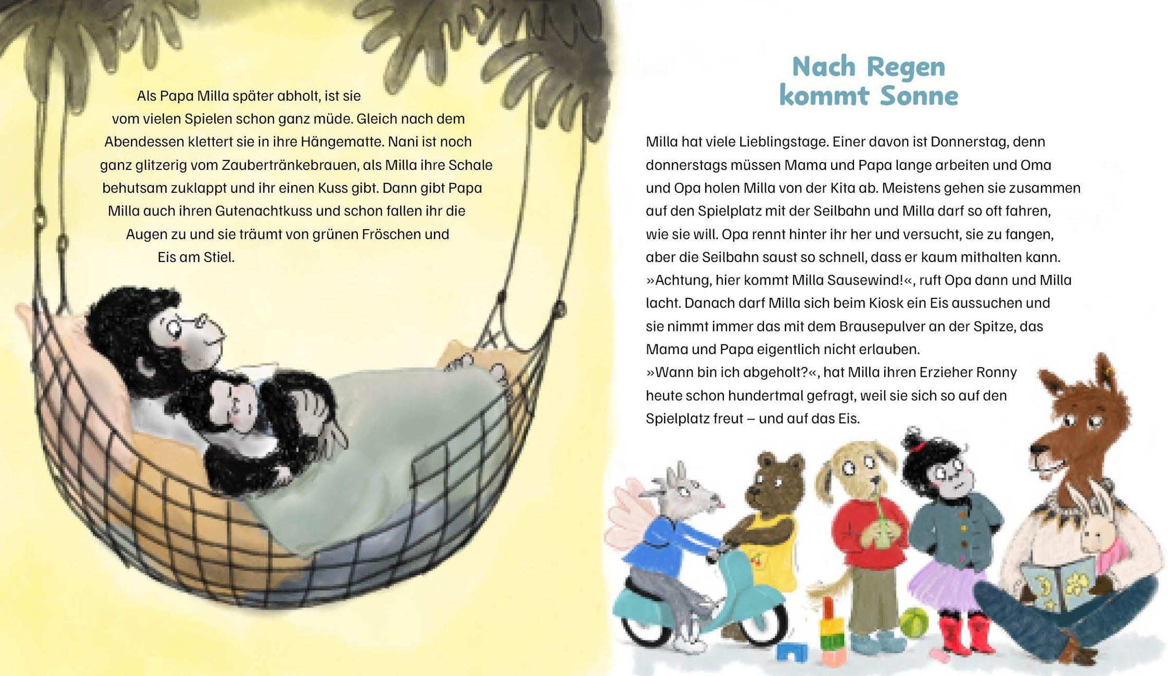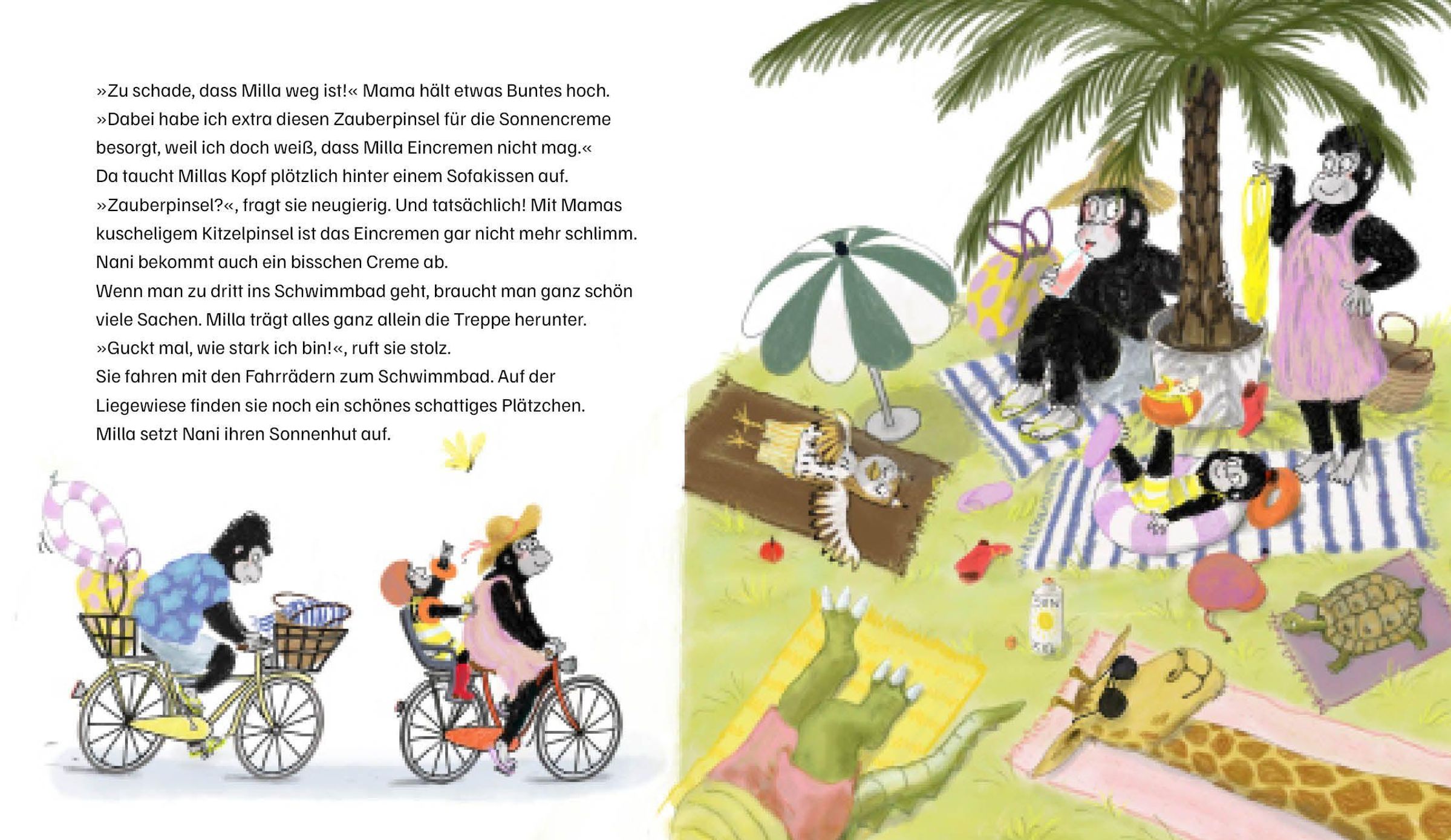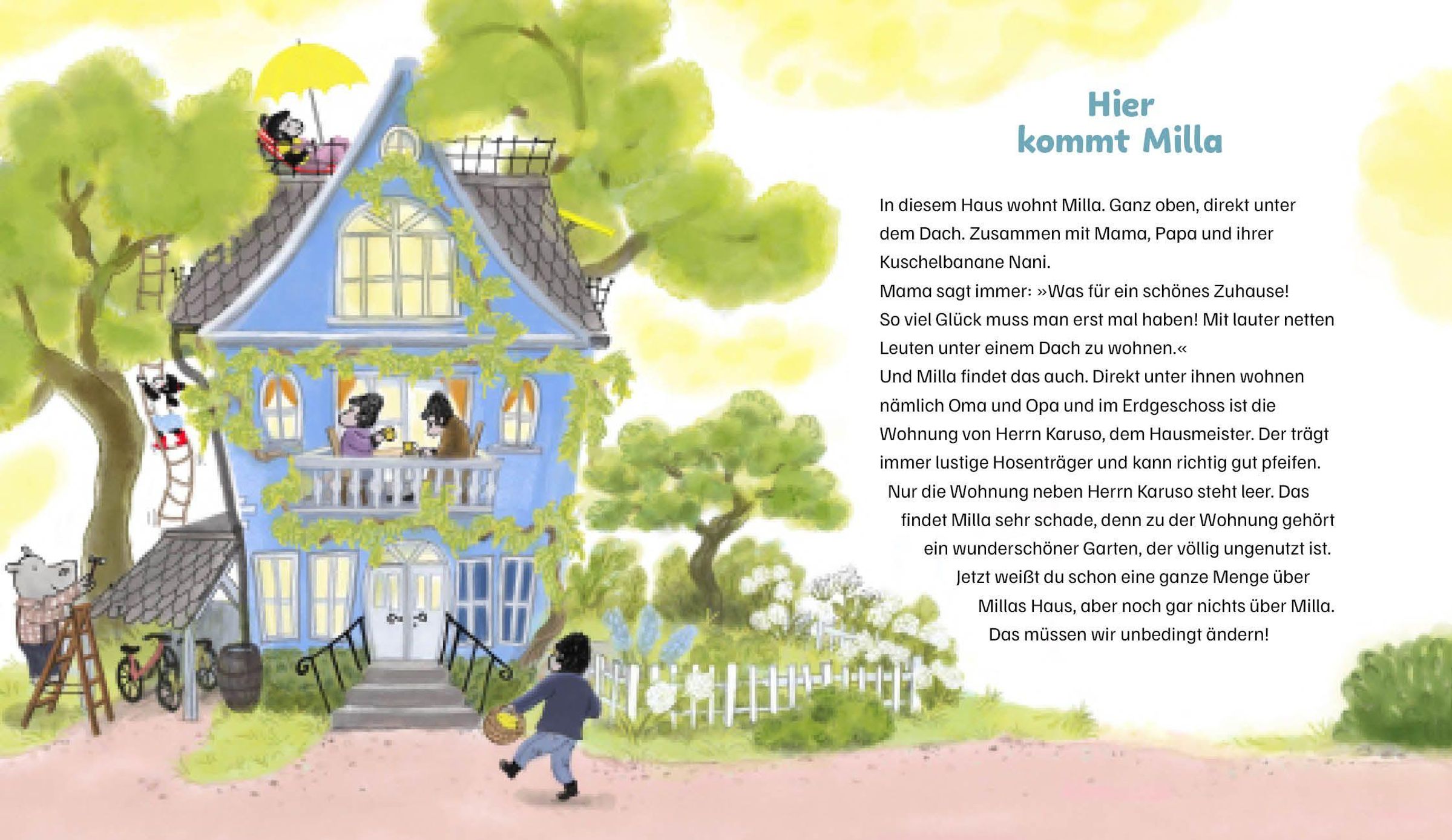 Milla ist ein kleines Gorillamädchen. Sie ist neugierig, stark, unerschrocken - und sehr niedlich. Sie lebt mit ihrem Papa und ihrer Mama in einer Wohnung direkt unterm Dach. Wie in einem Baumhaus fühlt sich das an. Jeden Tag erlebt sie etwas Neues und nimmt uns dabei mit: Aufregend wird es, als Benjamin, der kleine Tiger, ins Haus zieht. Magisch wird es, als Benjamin und sie ein bisschen zaubern und Hausmeister Caruso, das liebenswerte Nilpferd, vielleicht in einen Frosch verwandeln. Und lecker (und sehr lustig) wird es, als sie mit ihren Eltern ins Freibad radelt, Schwimmbadpommes isst und ihr Papa beim Rutschen stecken bleibt!