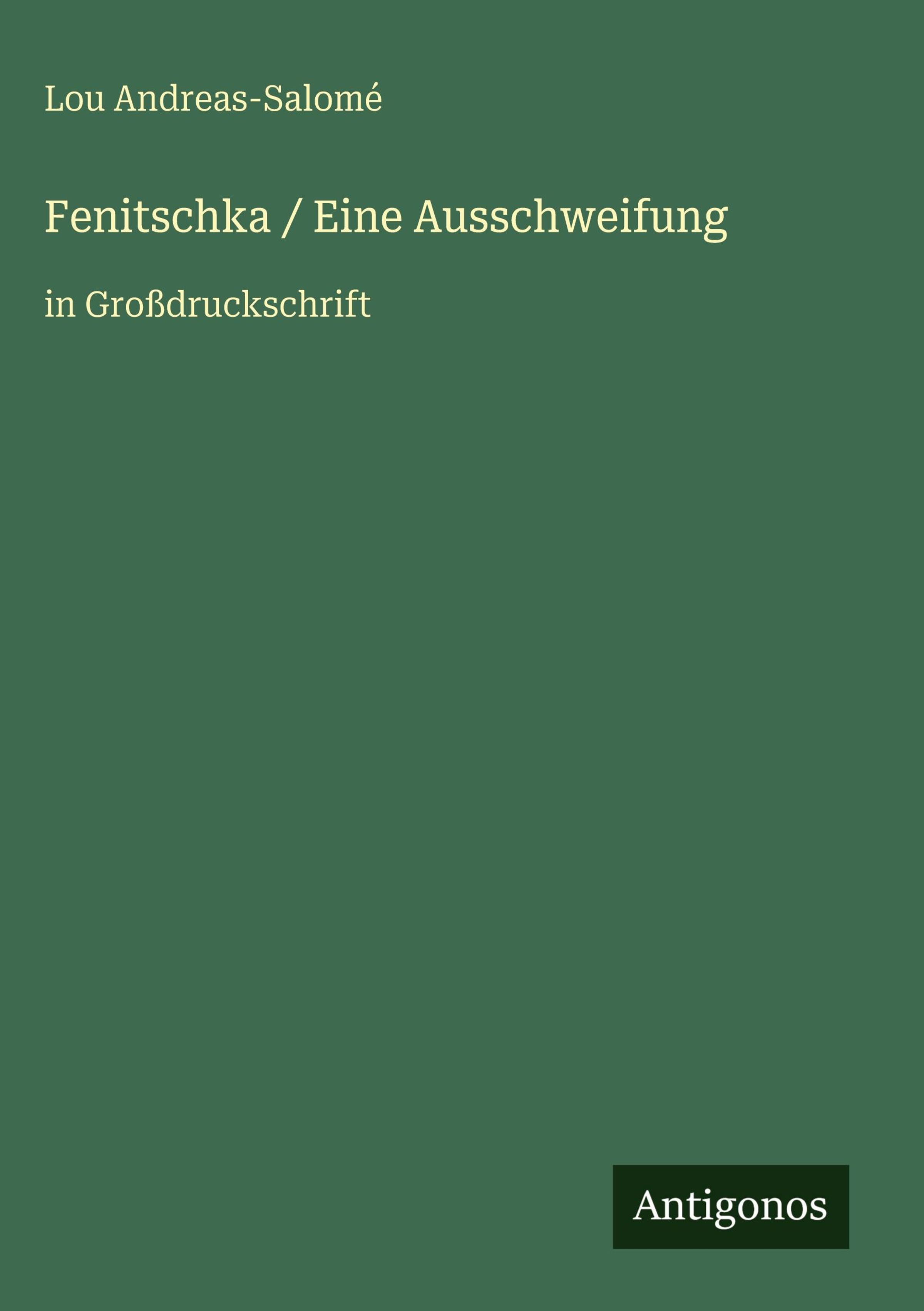 Text: "Lou Andreas-Salomé. Fenitschka / Eine Ausschweifung in Großdruckschrift." Unten rechts: "Antigonos". Hintergrund in Dunkelgrün., Buch