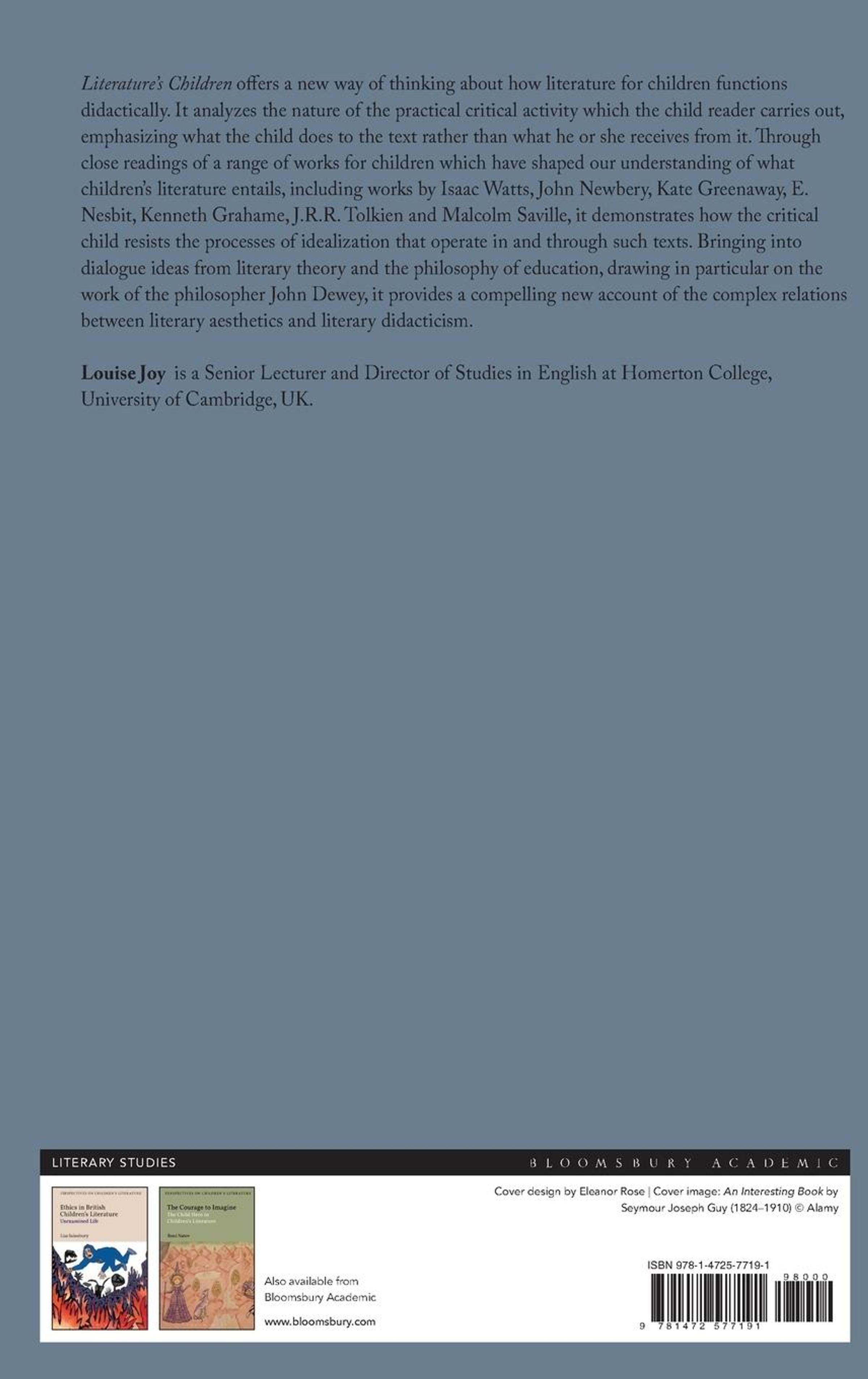 Literature's Children offers a new way of thinking about how literature for children functions didactically. It analyzes the nature of the practical critical activity which the child reader carries out, emphasizing what the child does to the text rather than what he or she receives from it. Through close readings of a range of works for children which have shaped our understanding of what children's literature entails, including works by Isaac Watts, John Newbery, Kate Greenaway, E. Nesbit, Kenneth Grahame, J. R.R. Tolkien and Malcolm Saville, it demonstrates how the critical child resists the processes of idealization in operation in and through such texts. Bringing into dialogue ideas from literary theory and the philosophy of education, drawing in particular on the work of the philosopher John Dewey, it provides a compelling new account of the complex relations between literary aesthetics and literary didacticism.
