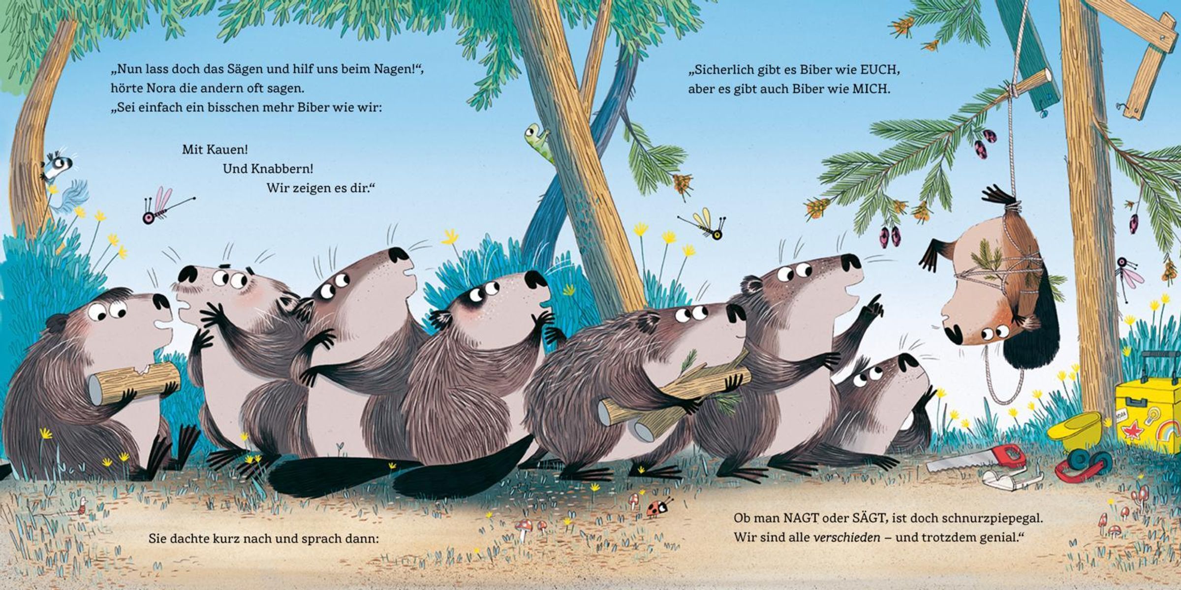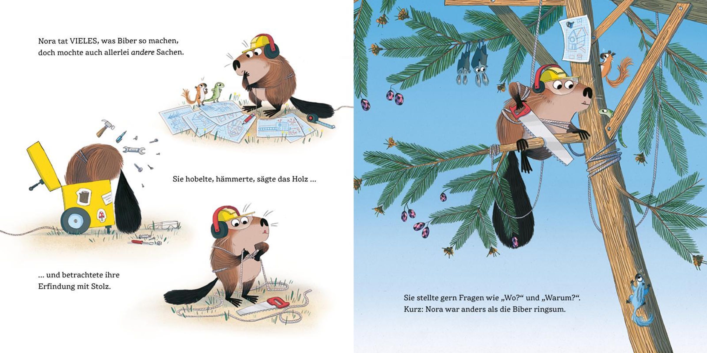 Während alle Biber fleißig nagen und bauen, geht Nora ihren eigenen Weg: Sie sägt, tüftelt und stellt Fragen. Als ein heftiger Regen den Fluss gefährlich ansteigen lässt, zeigt sich, wie stark Mut und Einfallsreichtum sein können. Mit Werkzeug, Köpfchen und großer Entschlossenheit baut Nora ein Biberboot, das ihre Familie und Freunde rettet.