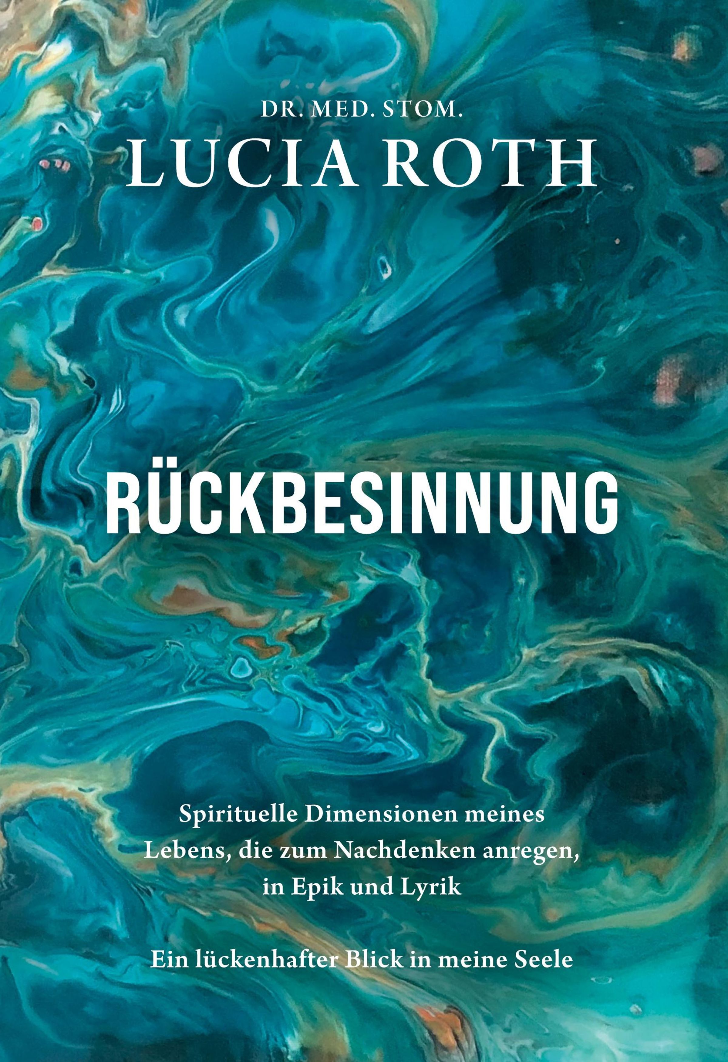 Text: "RÜCKBESINNUNG, Spirituelle Dimensionen meines Lebens... Epik und Lyrik, Ein lückenhafter Blick in meine Seele." Hintergrund: Abstrakte blaue Muster., Buch