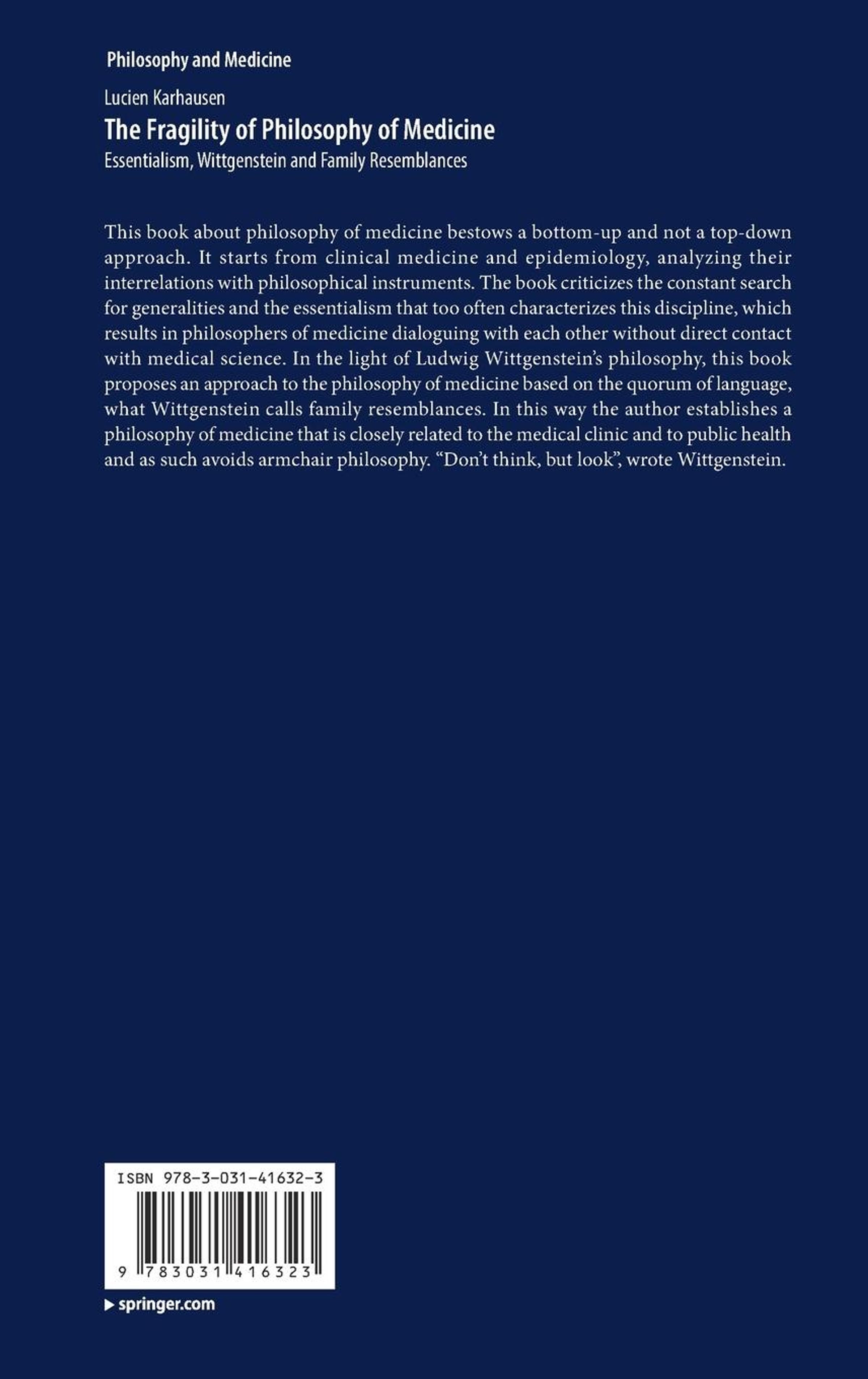 This book about philosophy of medicine bestows a bottom-up and not a top-down approach. It starts from clinical medicine and epidemiology, analyzing their interrelations with philosophical instruments. The book criticizes the constant search for generalities and the essentialism that too often characterizes this discipline, which results in philosophers of medicine dialoguing with each other without direct contact with medical science. In the light of Ludwig Wittgenstein's philosophy, this book proposes an approach to the philosophy of medicine based on the quorum of language, what Wittgenstein calls family resemblances. In this way the author establishes a philosophy of medicine that is closely related to the medical clinic and to public health and as such avoids armchair philosophy. ¿Don¿t think, but look", wrote Wittgenstein.