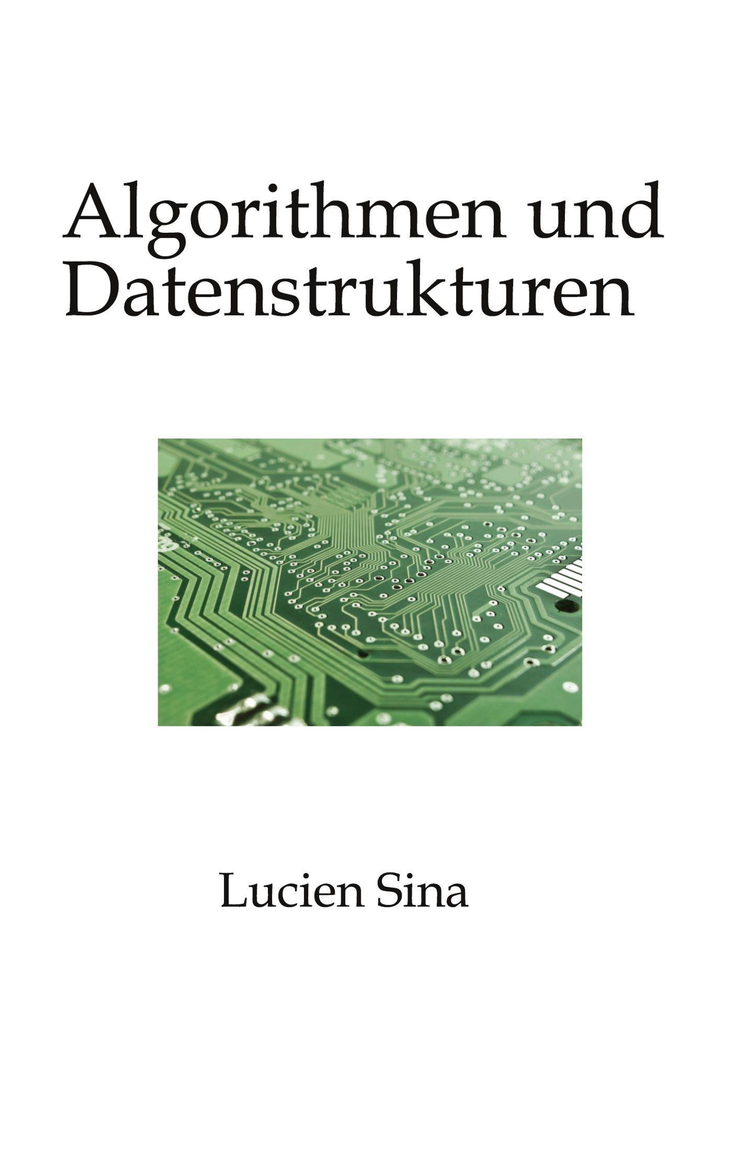 "Algorithmen und Datenstrukturen" oben, "Lucien Sina" unten. Illustration: eine grüne Leiterplatte., Buch