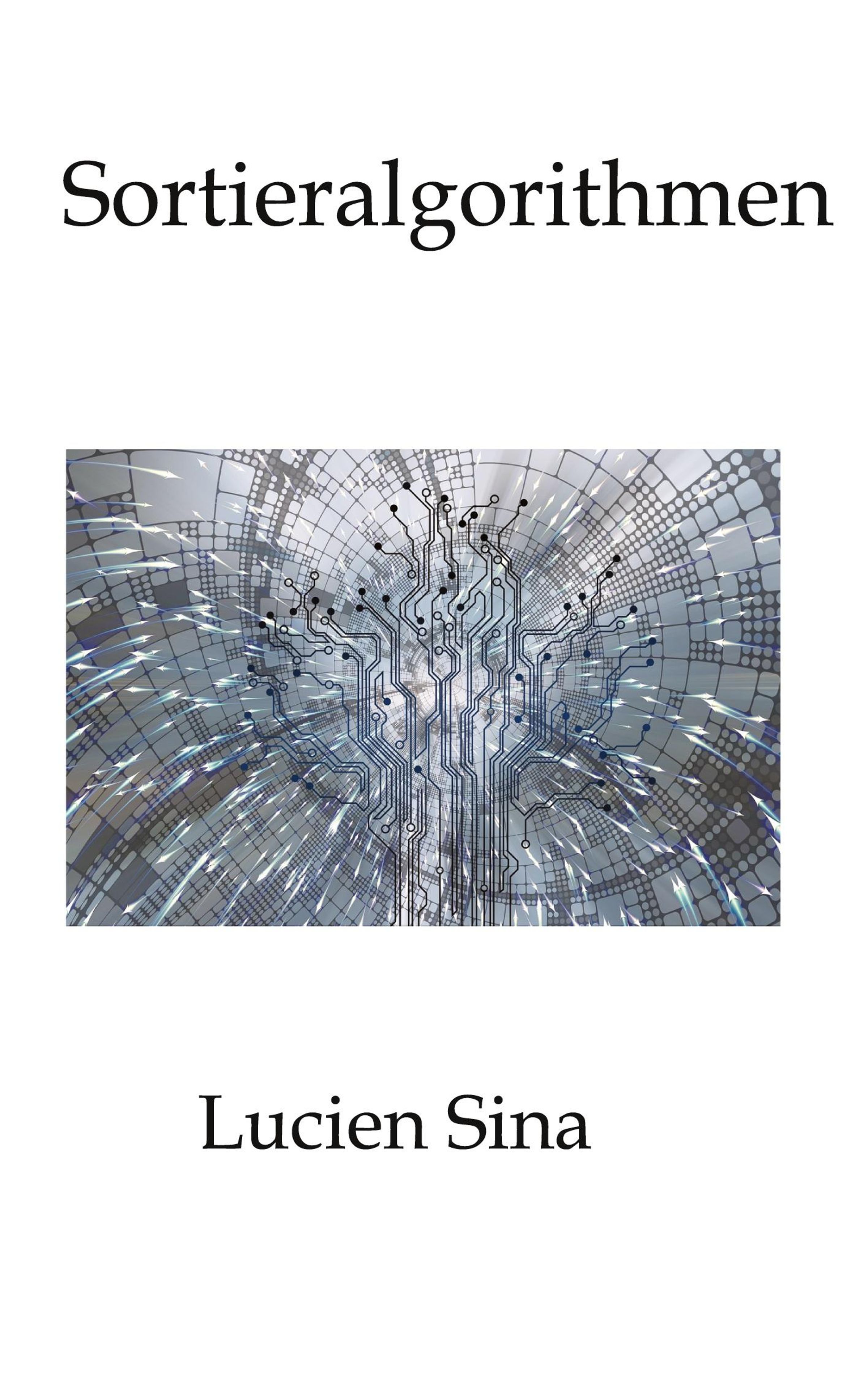 "Sortieralgorithmen" und "Lucien Sina" sind auf weißem Hintergrund. Darunter eine Illustration von Platinen mit digitalen Linien., Buch