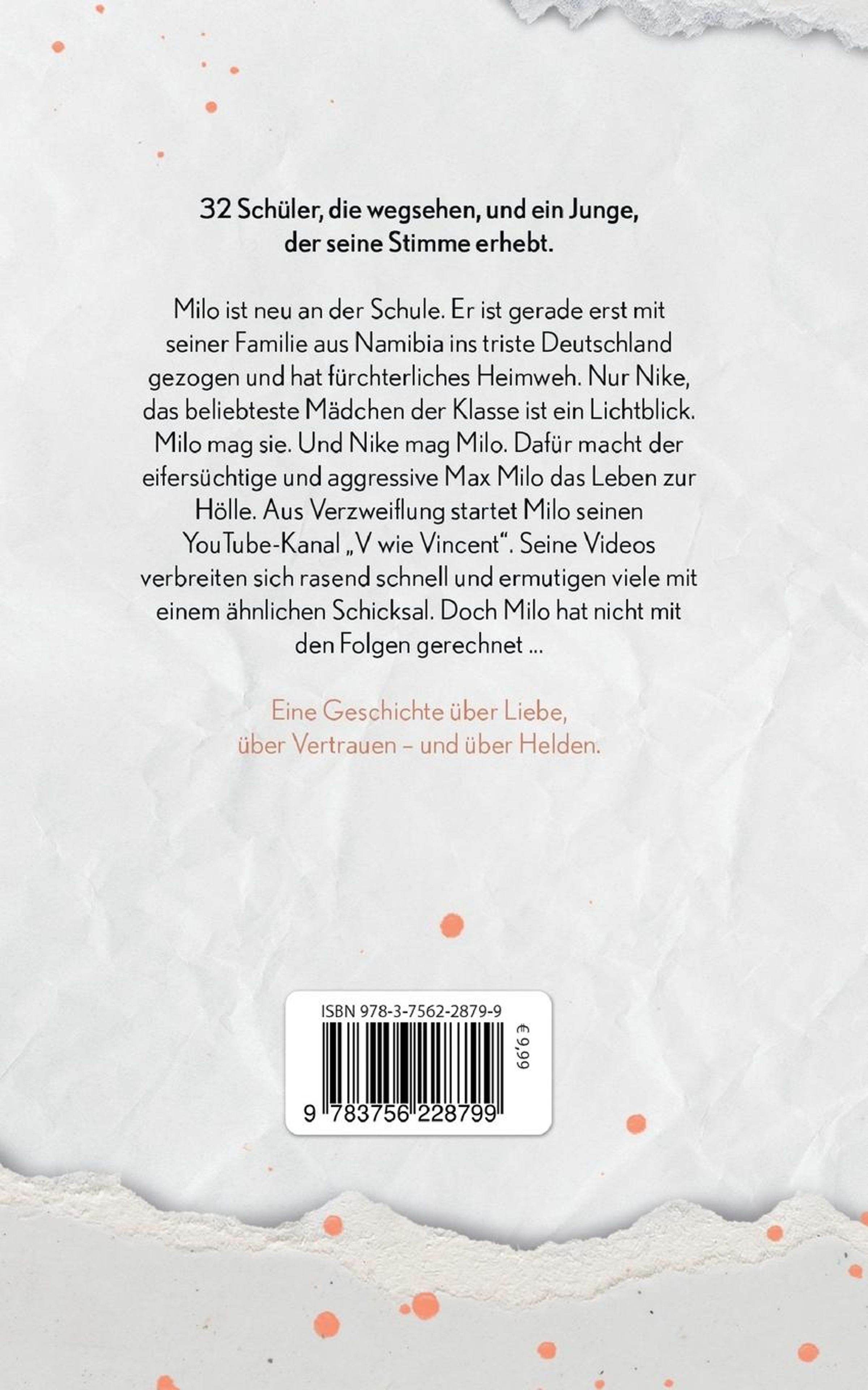 32 Schüler, die wegsehen und ein Junge, der seine Stimme erhebt. Milo ist neu an der Schule. Er ist gerade erst mit seiner Familie aus Namibia ins triste Deutschland gezogen und hat fürchterliches Heimweh. Nur Nike, das beliebteste Mädchen der Klasse ist ein Lichtblick. Milo mag sie. und Nike mag Milo. Dafür macht der eifersüchtige und aggressive Max Milo das Leben zur Hölle. Aus Verzweiflung startet Milo seinen YouTube-Kanal "V wie Vincent". Seine Videos verbreiten sich rasend schnell und ermutigen viele mit einem ähnlichen Schicksal. Doch Milo hat nicht mit den Folgen gerechnet.