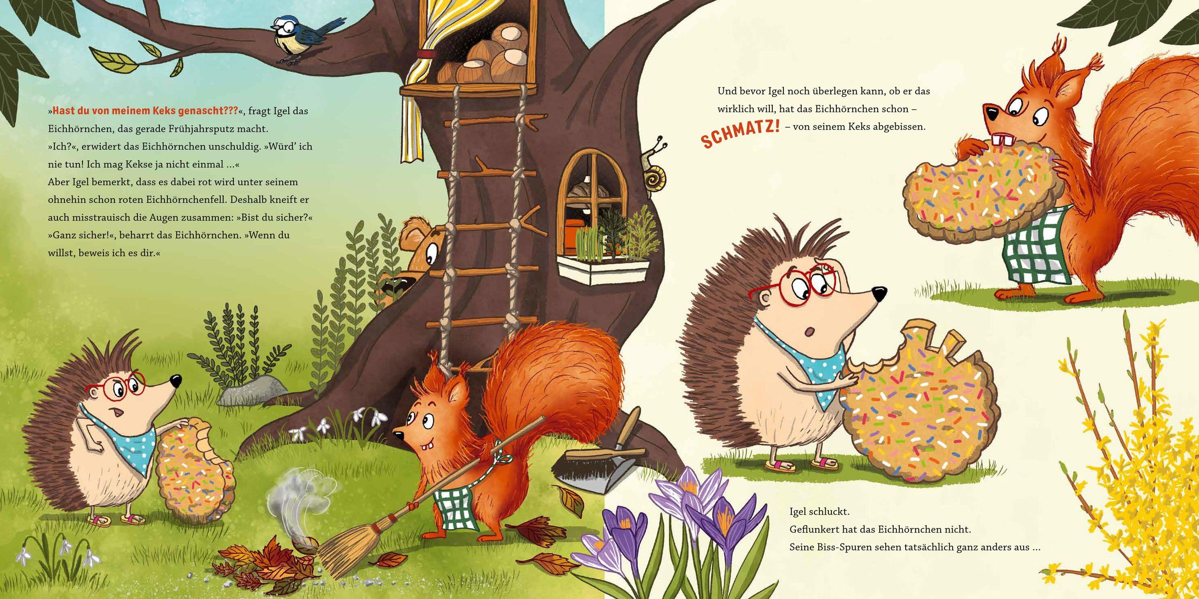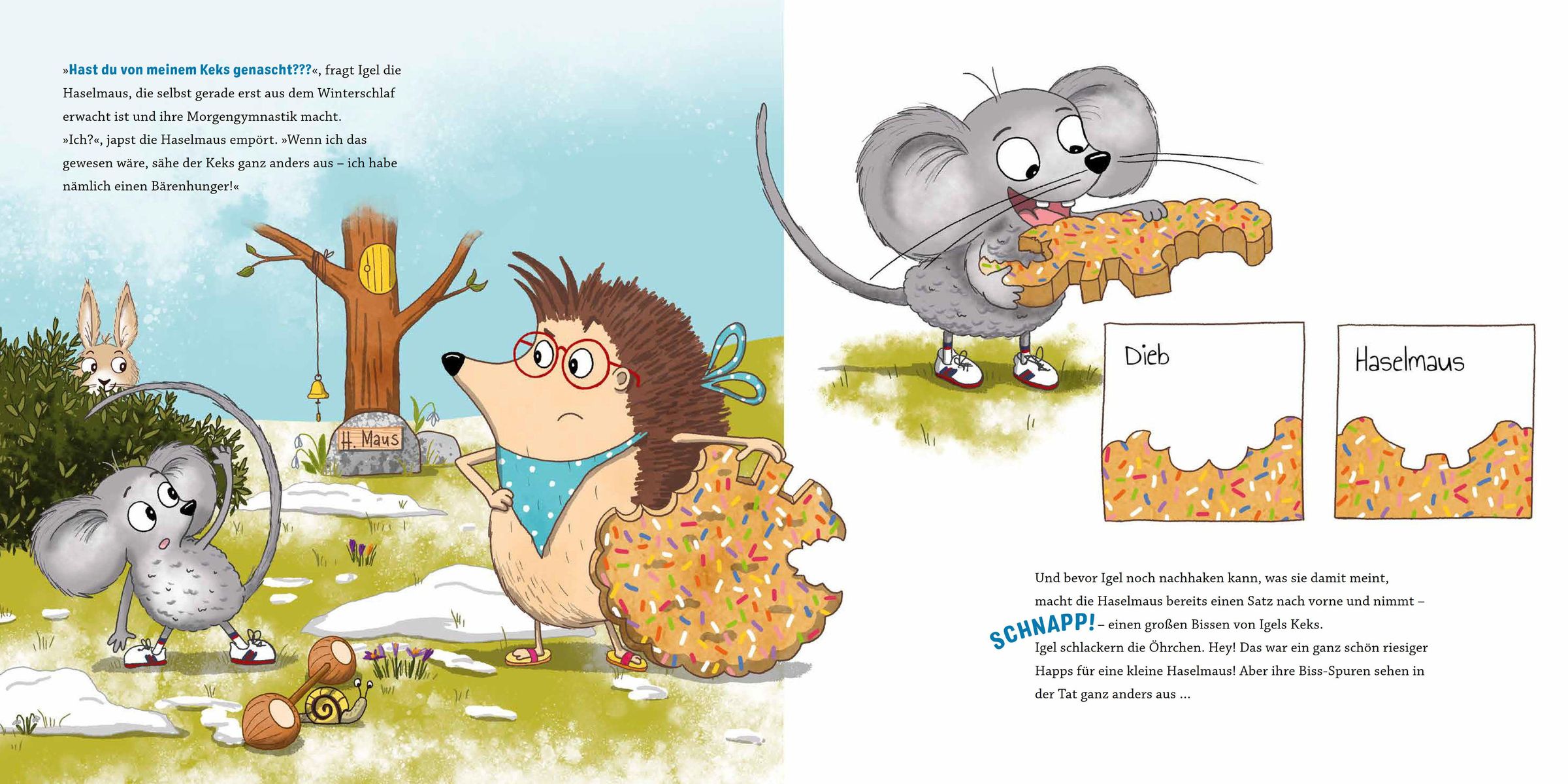 Igel traut seinen Augen kaum: Da liegt der leckerste Keks der Welt, direkt vor seiner Haustür. Heute muss sein Glückstag sein! Doch als er kurz in seinem Bau verschwindet, nascht doch tatsächlich jemand von seiner Leckerei - unerhört! Die Bissspuren sind deutlich zu erkennen, und Igel beschließt, sich den Keksdieb zu schnappen! Aber mit jedem Waldbewohner, der seine Unschuld beweisen will, indem er in den Keks beißt und seine Bissspuren zeigt, wird Igels Keks kleiner. Ob er wohl versteht, dass ein kleiner Keks ausreicht, wenn er am Ende ganz groß geteilt wird?