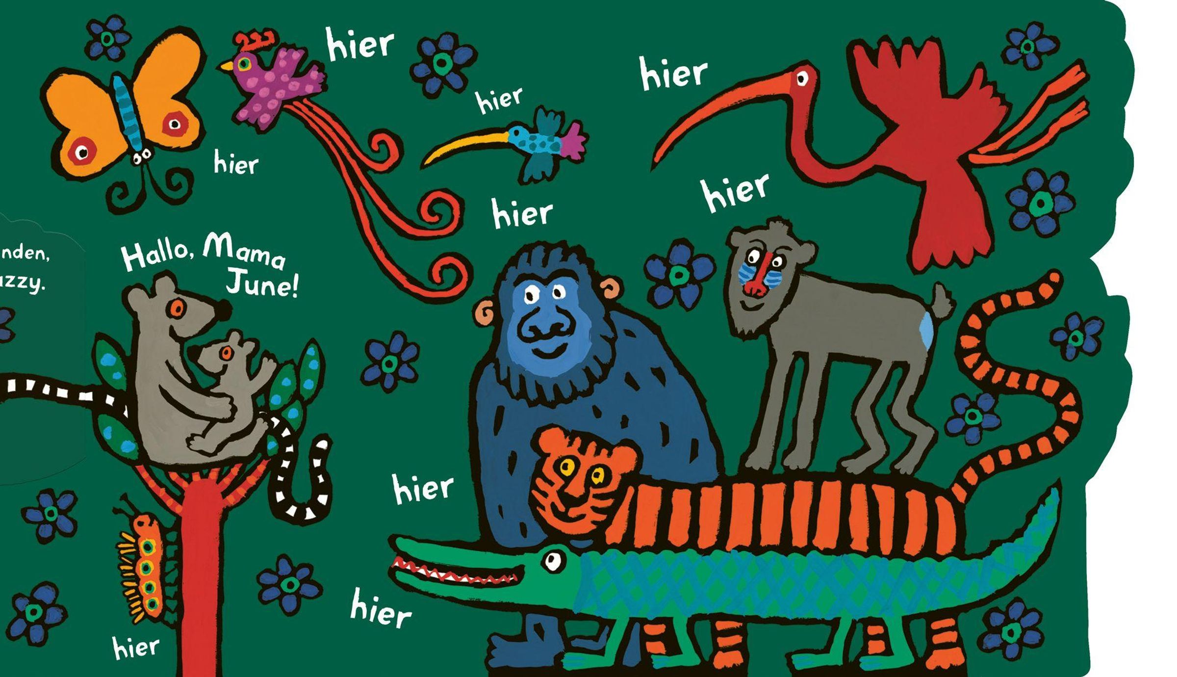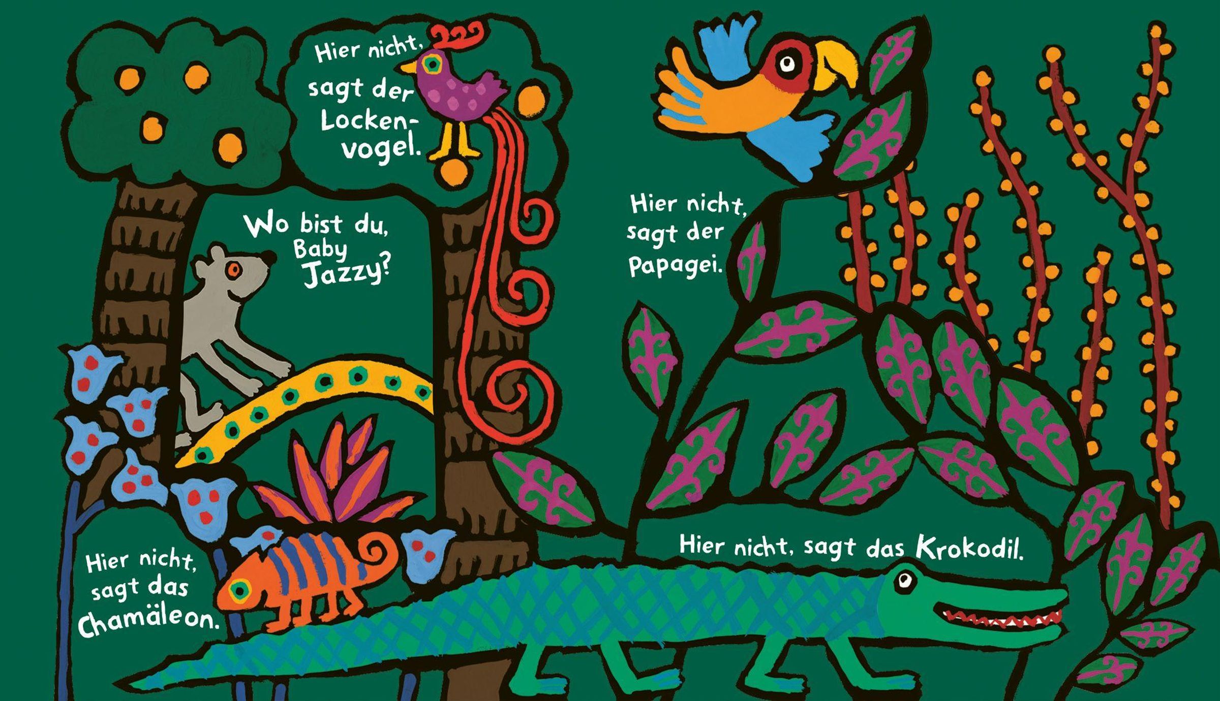 Tief im Dschungel spielen Mama June und Baby Jazzy Verstecken. Als die Mama ihr Baby nicht finden kann, fragt sie verschiedene Tiere nach ihm. Dann schauen alle Dschungeltiere zusammen bei den Fingerbäumen nach. Plötzlich sehen sie zwei orangenfarbene Augen zwischen den Blättern hervorleuchten.