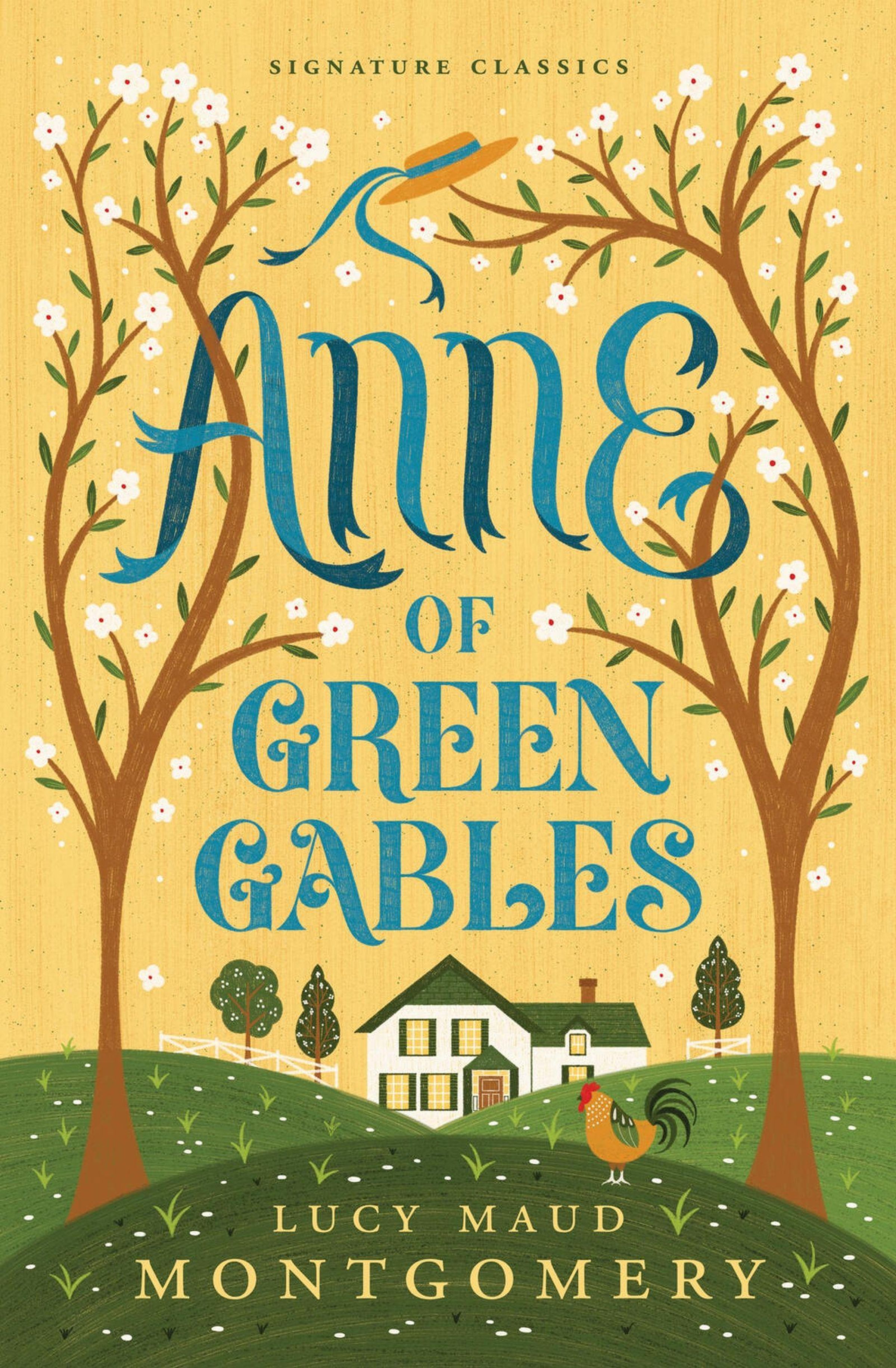 "Anne of Green Gables" in blauer Schrift, darunter ein Bauernhaus mit Bäumen und Blumen. Ein Hahn steht auf einer Wiese., Buch