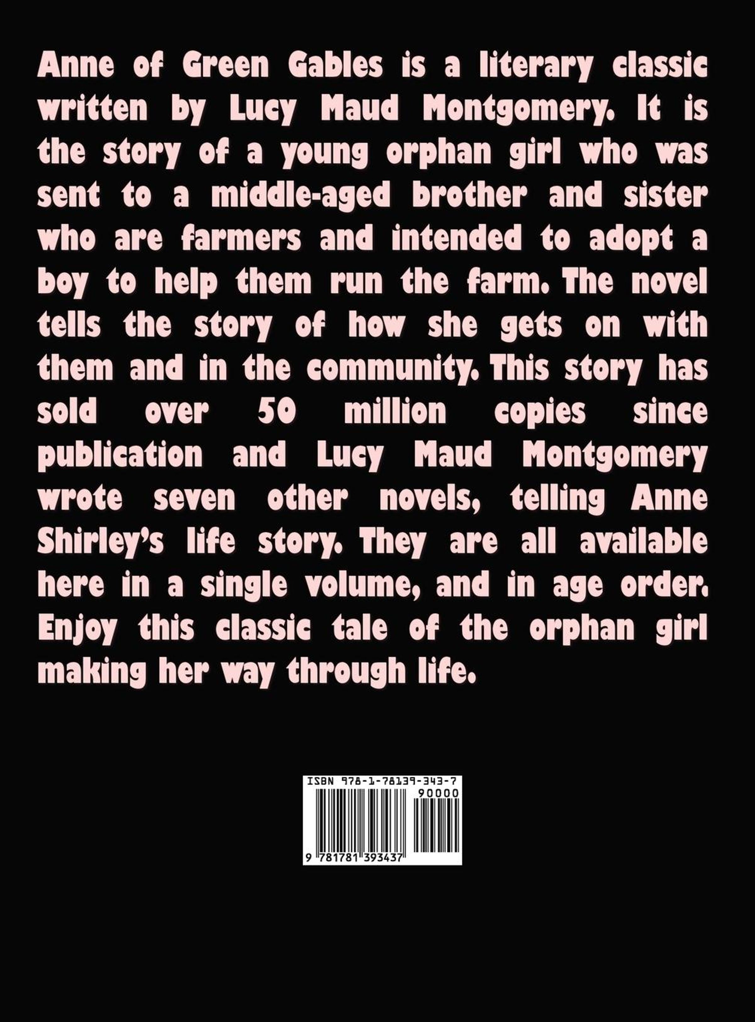 Anne of Green Gables is a literary classic written by Lucy Maud Montgomery. It is the story of a young orphan girl who was sent to a middle-aged brother and sister who are farmers and intended to adopt a boy to help them run the farm. The novel tells the story of how she gets on with them and in the community. This story has sold over 50 million copies since publication and Lucy Maud Montgomery wrote seven other novels, telling Anne Shirley's life story. They are all available here in a single volume, and in age order. Enjoy this classic tale of the orphan girl making her way through life.