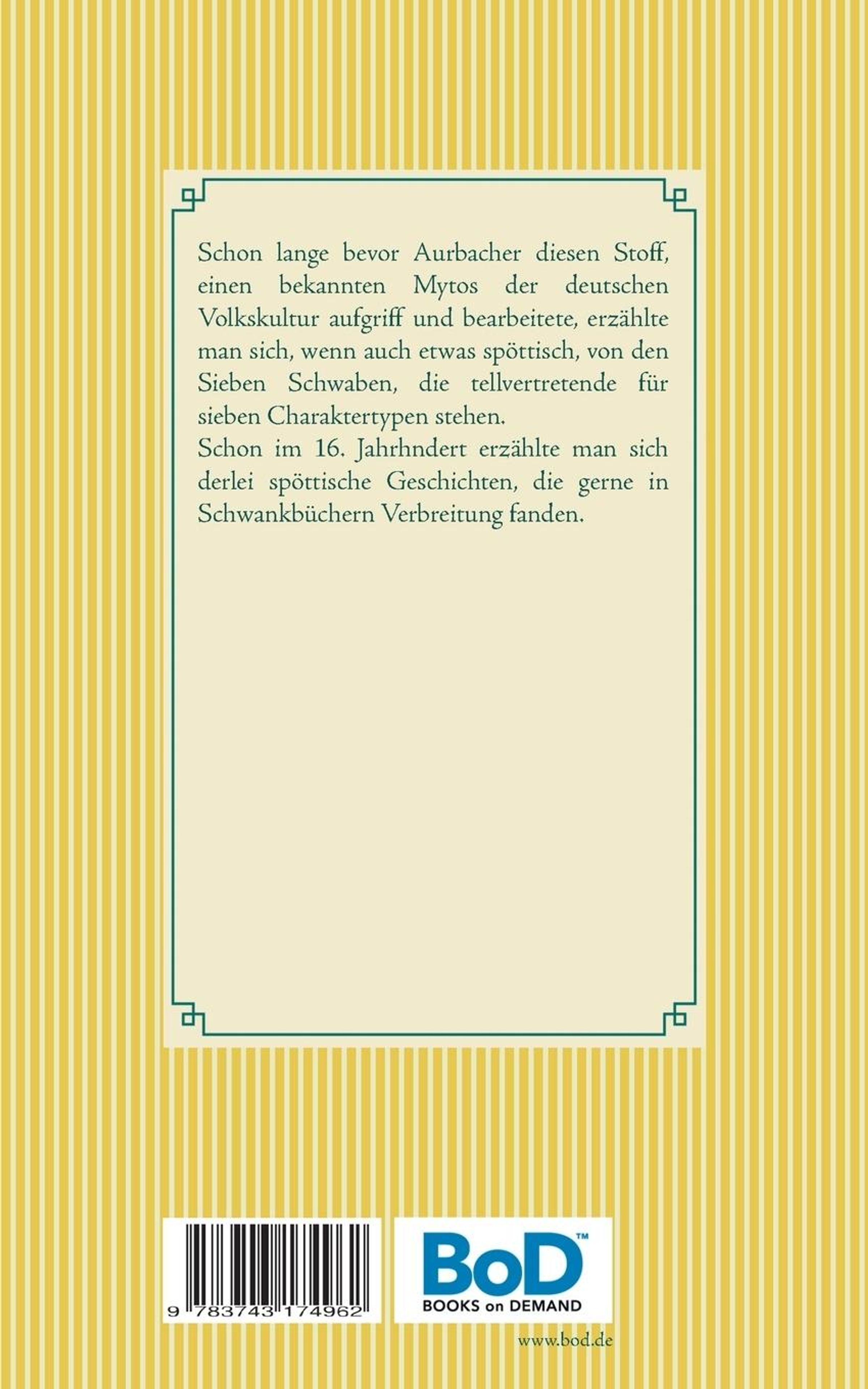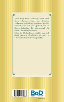 Schon lange bevor Aurbacher diesen Stoff, einen bekannten Mythos der deutschen Volkskultur aufgriff und bearbeitete, erzählte man sich, wenn auch etwas spöttisch, von den Sieben Schwaben, die stellvertretende für sieben Charaktertypen stehen. Schon im 16. Jahrhundert erzählte man sich derlei spöttische Geschichten, die gerne in Schwankbüchern Verbreitung fanden.