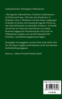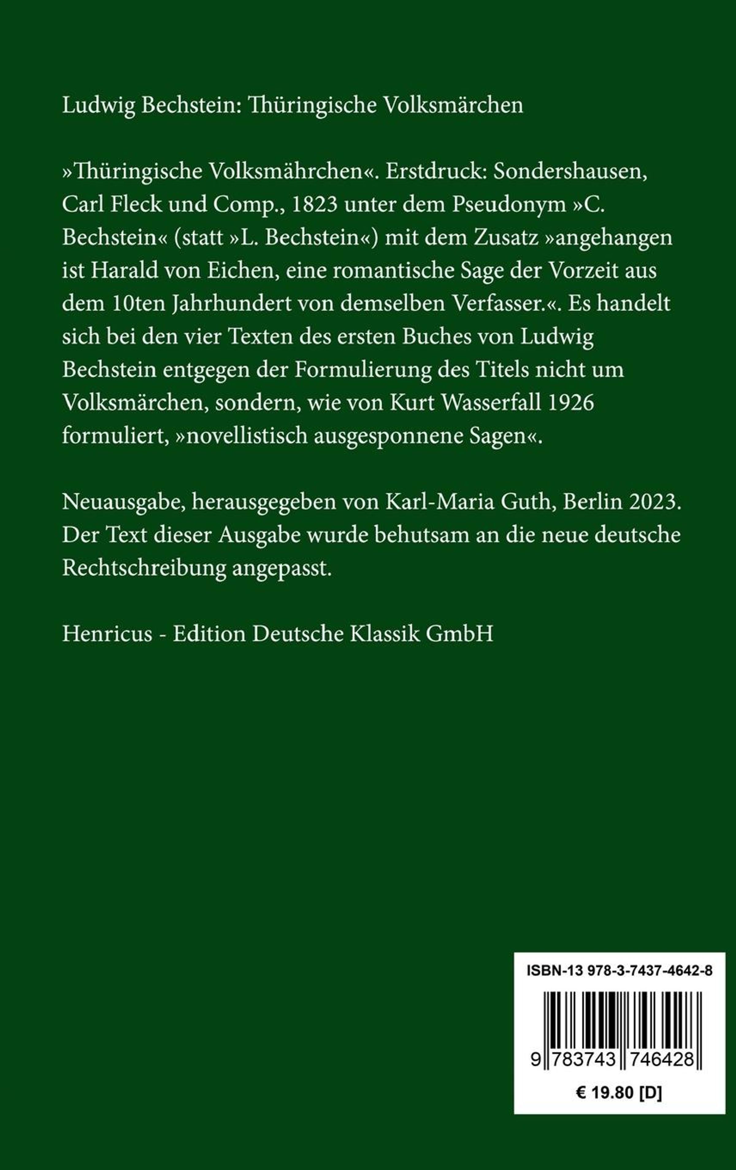 >>Thüringische Volksmährchen<<. Erstdruck: Sondershausen, Carl Fleck und Comp., 1823 unter dem Pseudonym >>C. Bechstein<< (statt >>L. Bechstein<<) mit dem Zusatz >>angehangen ist Harald von Eichen, eine romantische Sage der Vorzeit aus dem 10ten Jahrhundert von demselben Verfasser.<<. Es handelt sich bei den vier Texten des ersten Buches von Ludwig Bechstein entgegen der Formulierung des Titels nicht um Volksmärchen, sondern, wie von Kurt Wasserfall 1926 formuliert, >>novellistisch ausgesponnene Sagen<<.