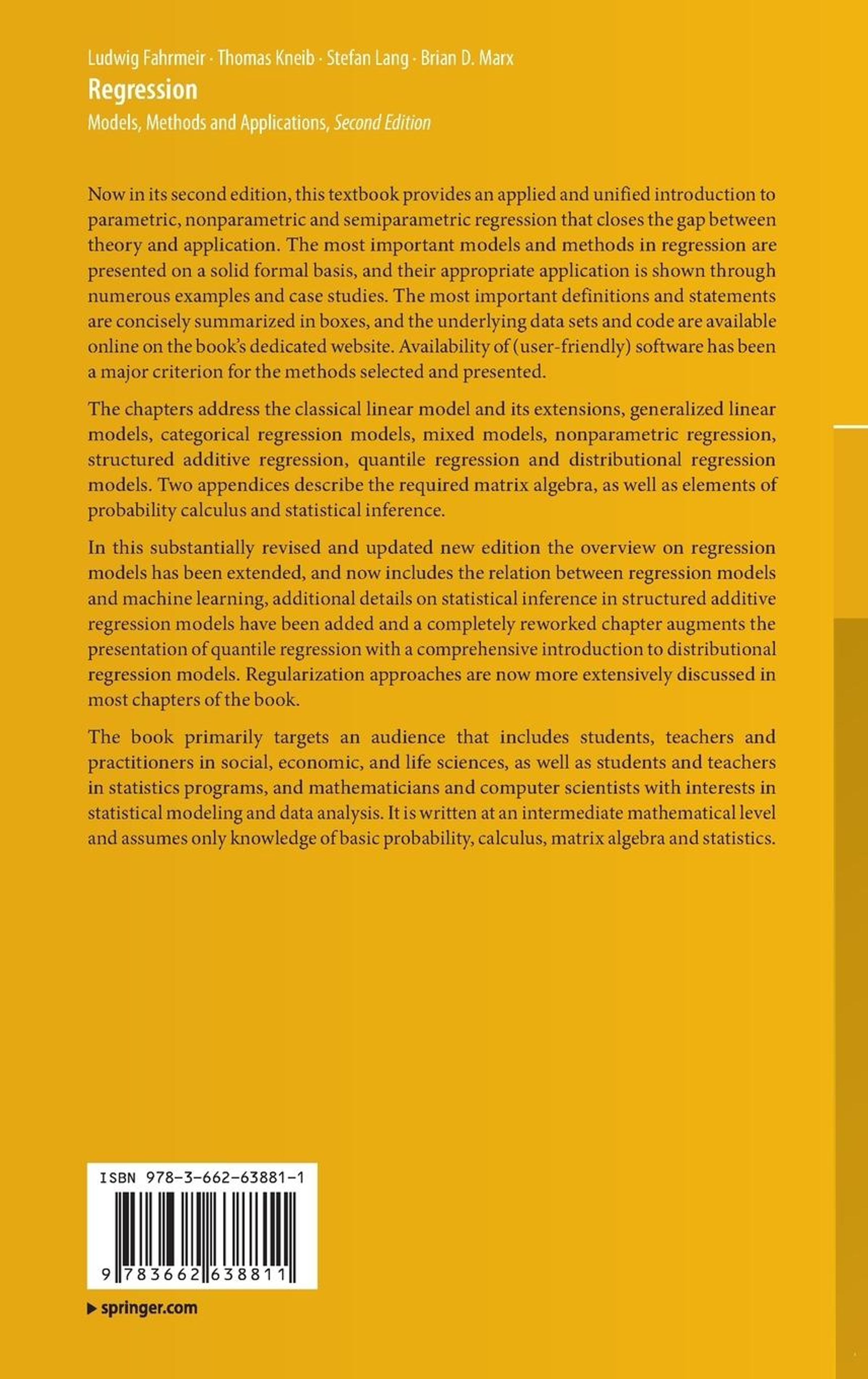 Now in its second edition, this textbook provides an applied and unified introduction to parametric, nonparametric and semiparametric regression that closes the gap between theory and application. The most important models and methods in regression are presented on a solid formal basis, and their appropriate application is shown through numerous examples and case studies. The most important definitions and statements are concisely summarized in boxes, and the underlying data sets and code are available online on the books dedicated website. Availability of (user-friendly) software has been a major criterion for the methods selected and presented. The chapters address the classical linear model and its extensions, generalized linear models, categorical regression models, mixed models, nonparametric regression, structured additive regression, quantile regression and distributional regression models. Two appendices describe the required matrix algebra, as well as elements of probability calculus and statistical inference. In this substantially revised and updated new edition the overview on regression models has been extended, and now includes the relation between regression models and machine learning, additional details on statistical inference in structured additive regression models have been added and a completely reworked chapter augments the presentation of quantile regression with a comprehensive introduction to distributional regression models. Regularization approaches are now more extensively discussed in most chapters of the book.