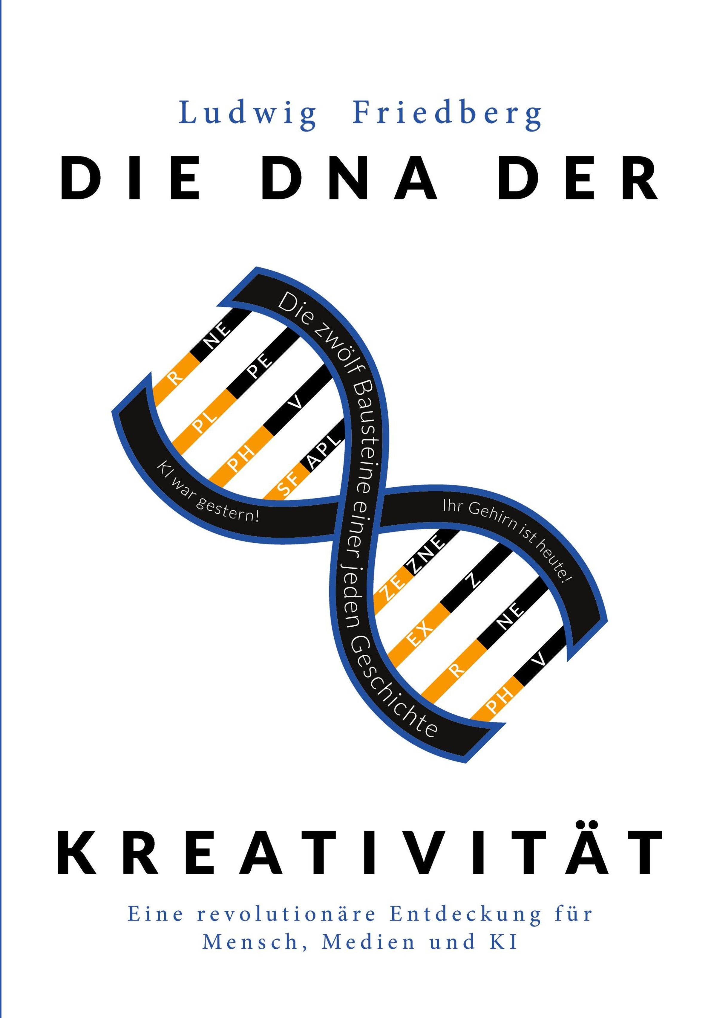 Text: "Die DNA der Kreativität", "Ludwig Friedberg", "Die zwölf Bausteine einer jeden Geschichte". Illustration: DNA-Helix., Buch
