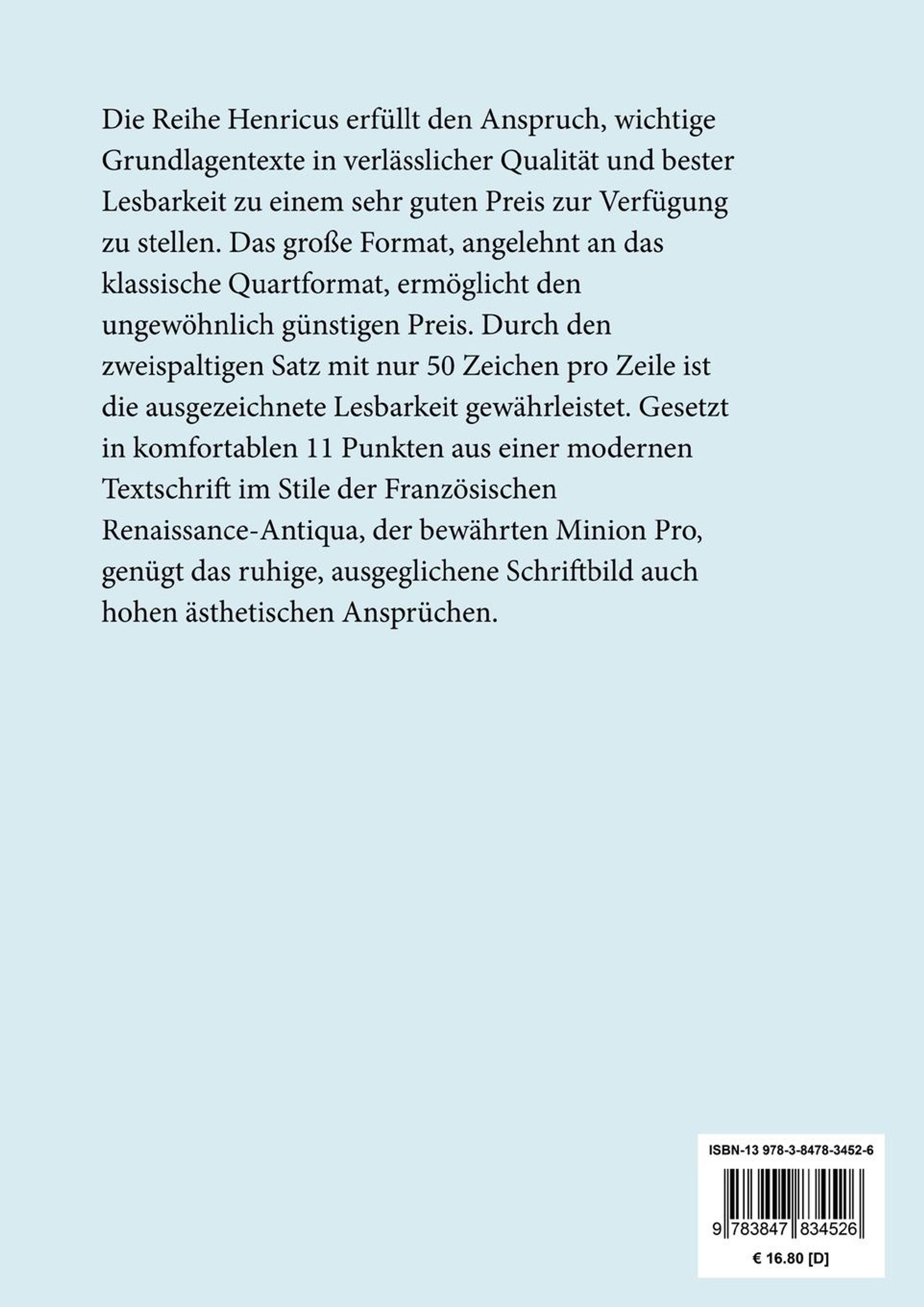 Die Reihe Henricus erfüllt den Anspruch, wichtige Grundlagentexte in verlässlicher Qualität und bester Lesbarkeit zu einem sehr guten Preis zur Verfügung zu stellen. Das große Format, angelehnt an das klassische Quartformat, ermöglicht den ungewöhnlich günstigen Preis. Durch den zweispaltigen Satz mit nur 50 Zeichen pro Zeile ist die ausgezeichnete Lesbarkeit gewährleistet. Gesetzt in komfortablen 11 Punkten aus einer modernen Textschrift im Stile der Französischen Renaissance-Antiqua, der bewährten Minion Pro, genügt das ruhige, ausgeglichene Schriftbild auch hohen ästhetischen Ansprüchen.