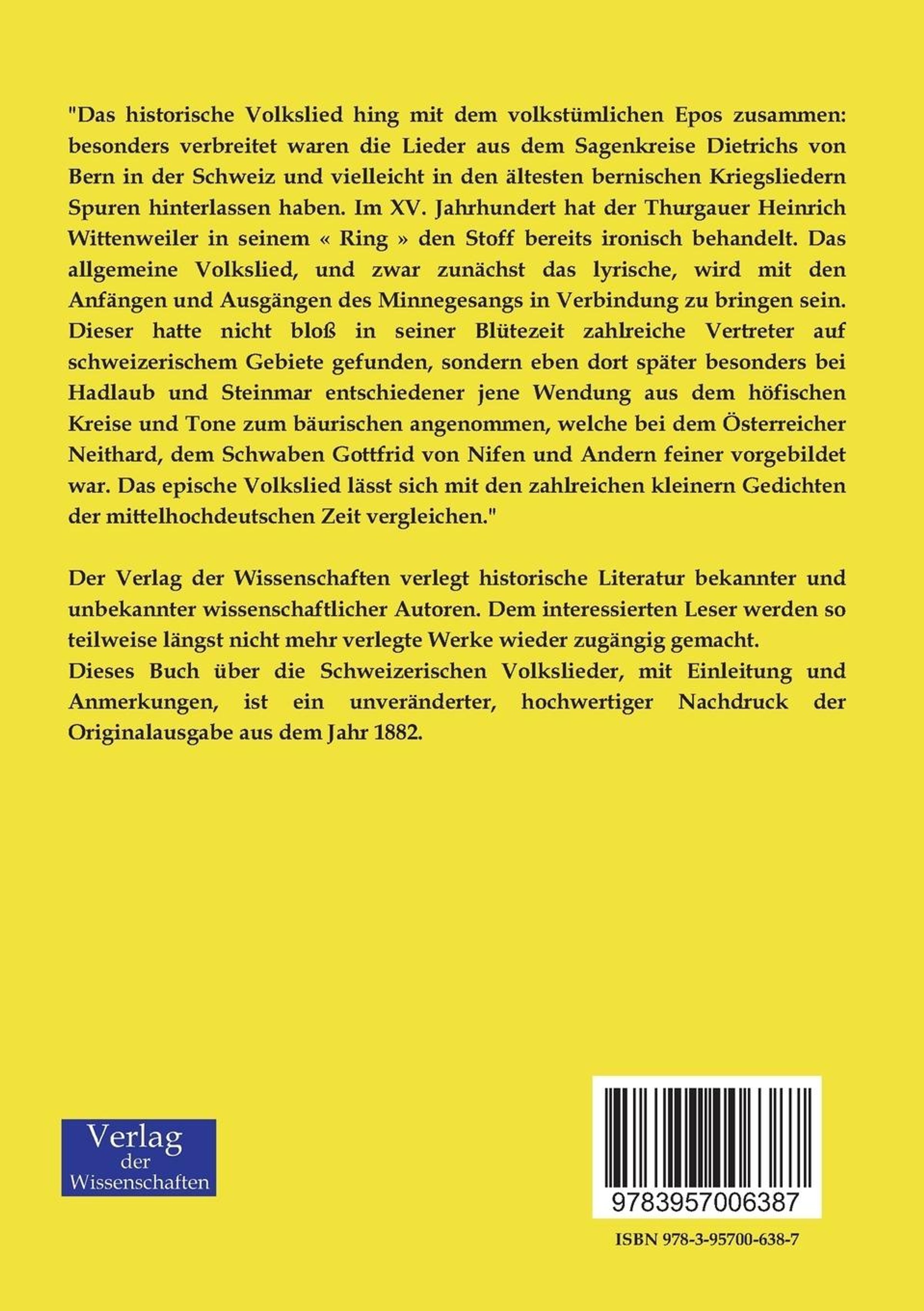 Der Verlag der Wissenschaften verlegt historische Literatur bekannter und unbekannter wissenschaftlicher Autoren. Dem interessierten Leser werden so teilweise längst nicht mehr verlegte Werke wieder zugängig gemacht. Dieses Buch über die Schweizerischen Volkslieder, mit Einleitung und Anmerkungen, ist ein unveränderter, hochwertiger Nachdruck der Originalausgabe aus dem Jahr 1882.