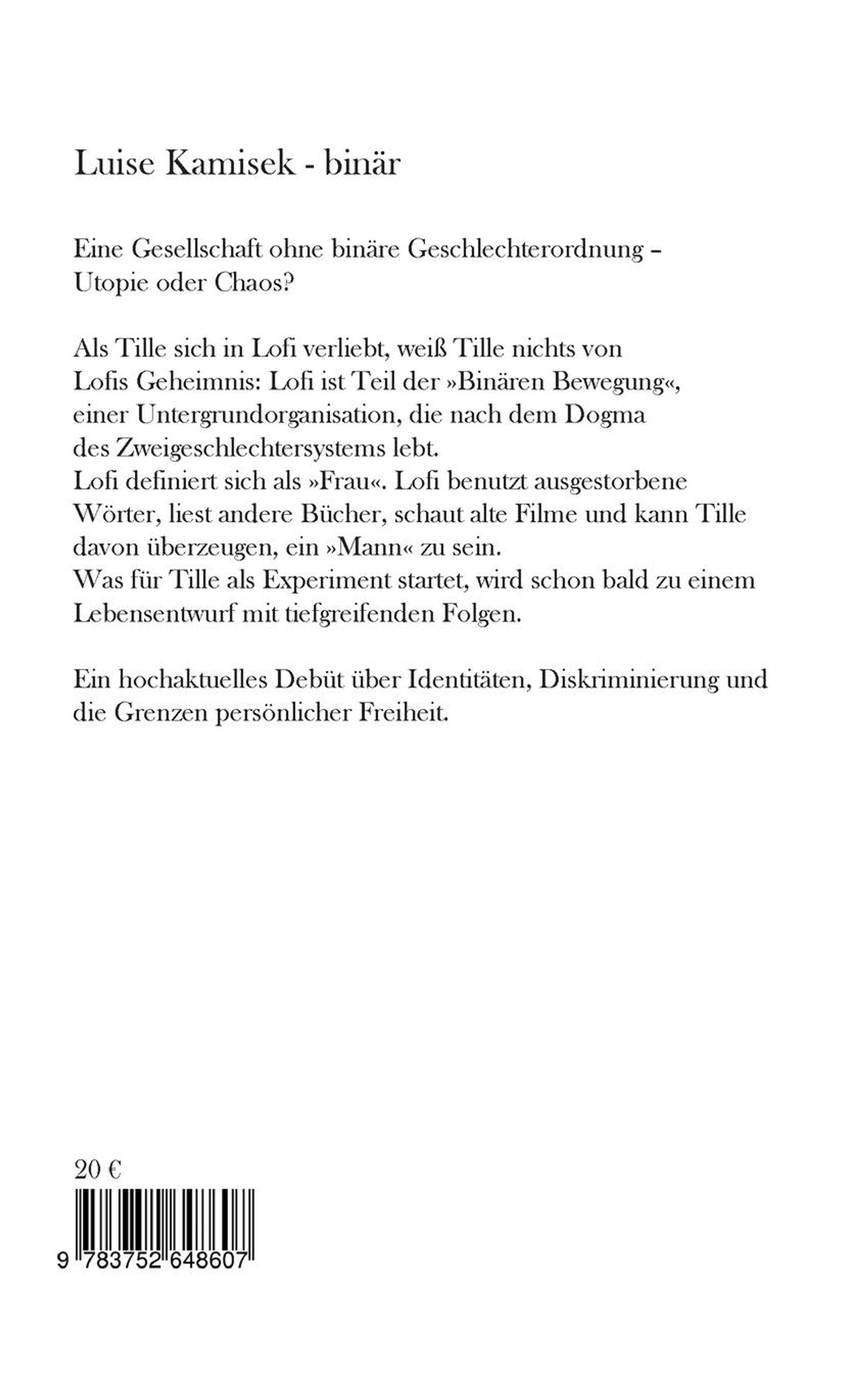 Als Tille sich in Lofi verliebt, weiß Tille nichts von Lofis Geheimnis: Lofi ist Teil der >>Binären Bewegung<<, einer Untergrundorganisation, die nach dem Dogma des Zweigeschlechtersystems lebt. Lofi definiert sich als >>Frau<<. Lofi benutzt ausgestorbene Wörter, liest andere Bücher, schaut alte Filme und kann Tille davon überzeugen, ein >>Mann<< zu sein. Was für Tille als Experiment startet, wird schon bald zu einem Lebensentwurf mit tiefgreifenden Folgen.