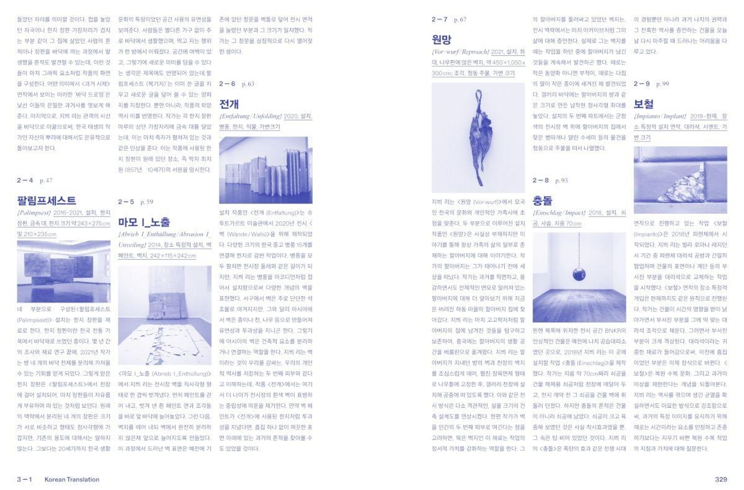 Jeewi Lee is interested in all the traces-the intimate imprints and distinctive markings-that we leave behind and that inhabit the spaces surrounding us. Abstract compositions of rescued stories, worn-out pavements and stripped down wallpapers, cut out floors, grains of sand that have traveled millions of years around the world, coffee stains or burnt wood. These traces, both human and historical, become vessels of stories and memories, inscribed on various materials, bearing witness to the past, present, and future. This publication offers a comprehensive exploration of the manifold tracings of the Berlin-based Korean artist over the past decade. It provides insight into her highly conceptual way of working and unveils previously unseen documentation of her deeply personal process of creation.