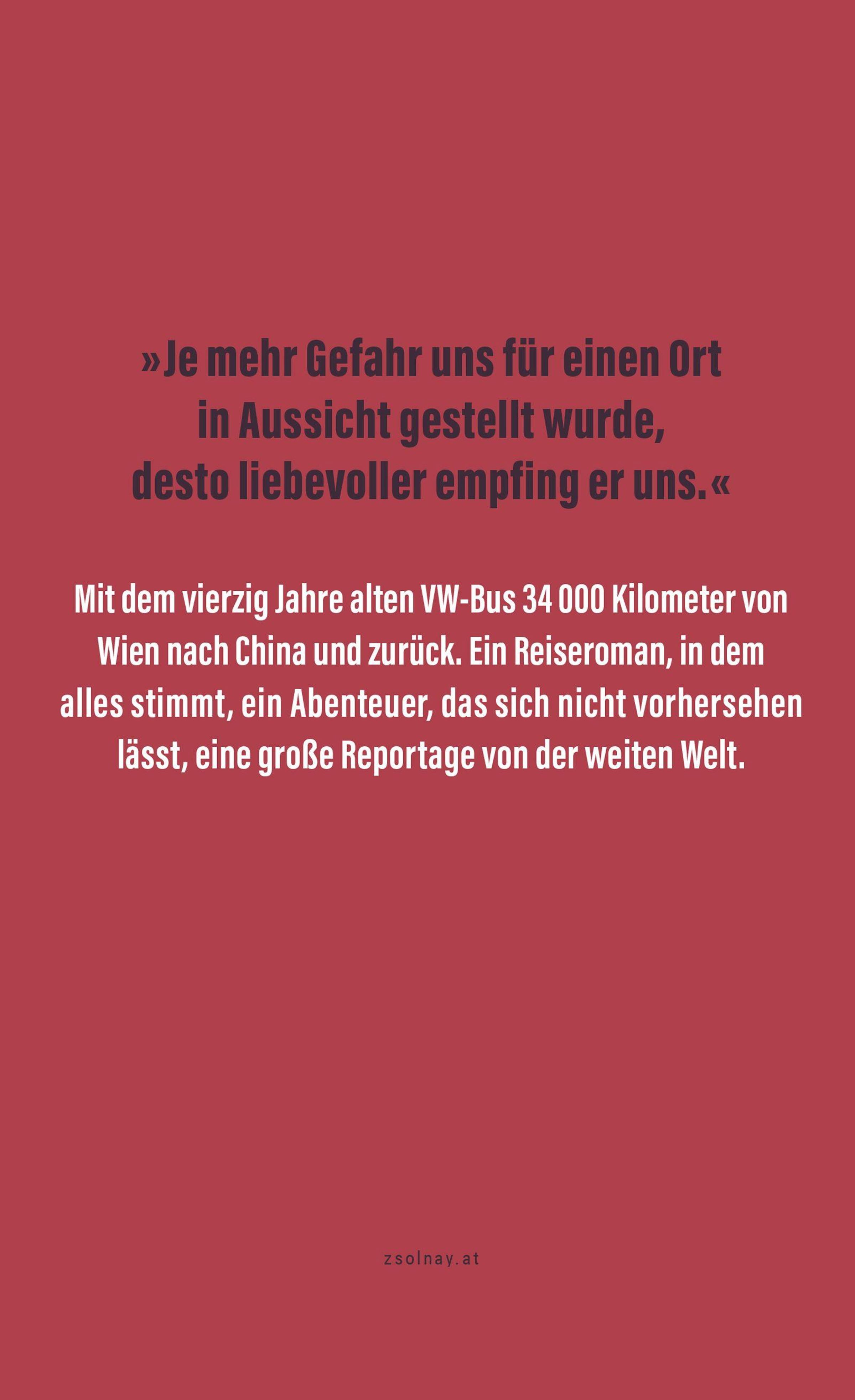 Blutige Trikots von kirgisischen Polospielern, Ziegelsteine von Osama bin Ladens Haus in Abbottabad, ein Bouquet von Bakterien aus Tadschikistan und Erfahrungen, die Tage im Polizeigewahrsam in Belutschistan mit sich bringen: Ein Jahr und 35.000 Kilometer waren Lukas Matzinger und Olivia Wimmer in einem vierzig Jahre alten VW-Bus unterwegs, von Wien nach China und zurück, stets mitten durch Risikogebiete. Doch hinter dem Ende der Welt, in den bedrohlichsten und unwirtlichsten Gegenden, warteten die wundersamsten Begegnungen: Fremde gaben die besten Bissen und die breitesten Betten - und beschenkten sie mit ihren Geschichten. Ein Reiseroman, in dem alles stimmt, ein Abenteuer, das sich nicht vorhersehen ließ, eine große Reportage von der weiten Welt.