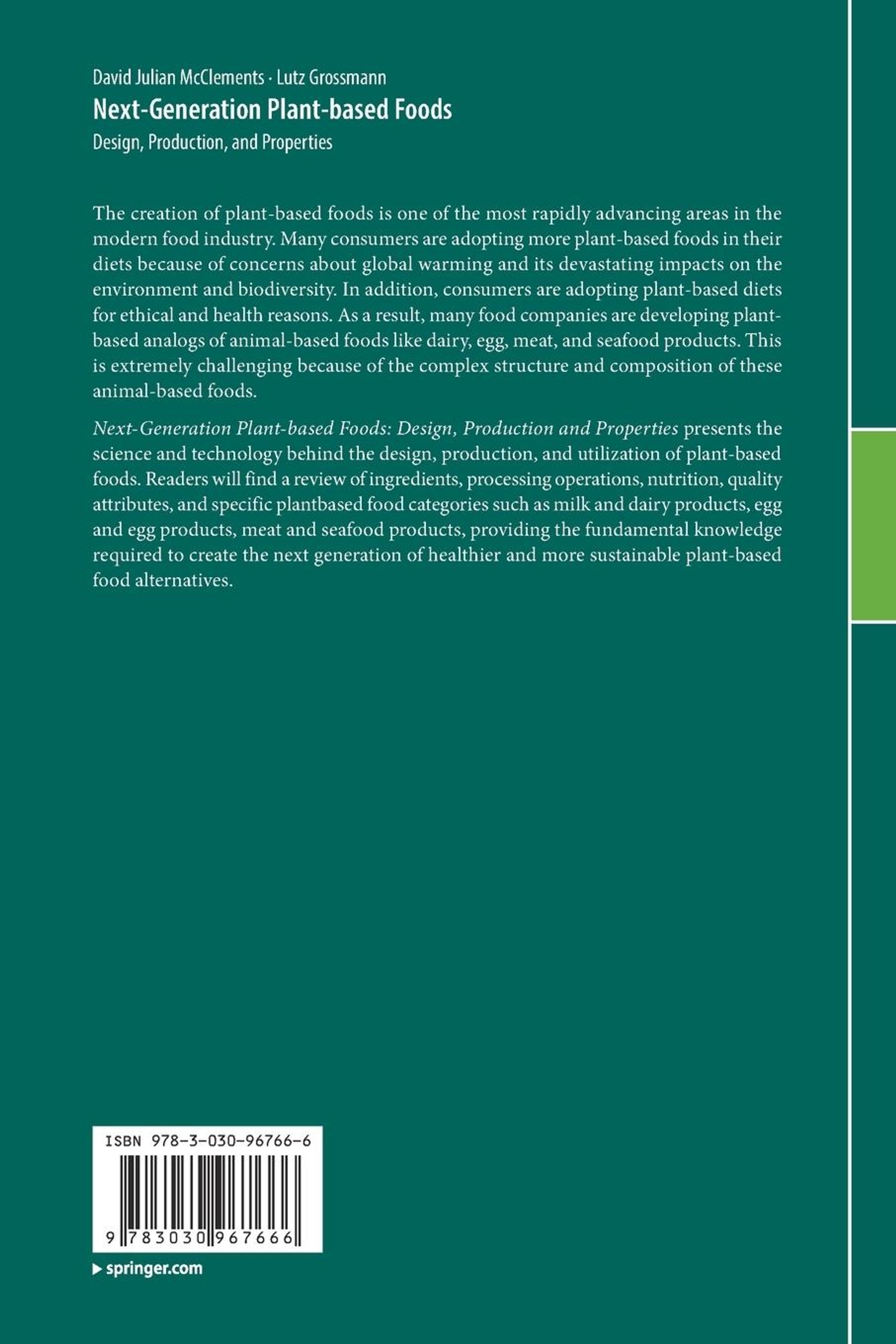The creation of plant-based foods is one of the most rapidly advancing areas in the modern food industry. Many consumers are adopting more plant-based foods in their diets because of concerns about global warming and its devastating impacts on the environment and biodiversity. In addition, consumers are adopting plant-based diets for ethical and health reasons. As a result, many food companies are developing plant-based analogs of animal-based foods like dairy, egg, meat, and seafood products. This is extremely challenging because of the complex structure and composition of these animal-based foods. Next-Generation Plant-based Foods: Design, Production and Properties presents the science and technology behind the design, production, and utilization of plant-based foods. Readers will find a review of ingredients, processing operations, nutrition, quality attributes, and specific plant-based food categories such as milk and dairy products, egg and egg products, meat and seafood products, providing the fundamental knowledge required to create the next generation of healthier and more sustainable plant-based food alternatives.