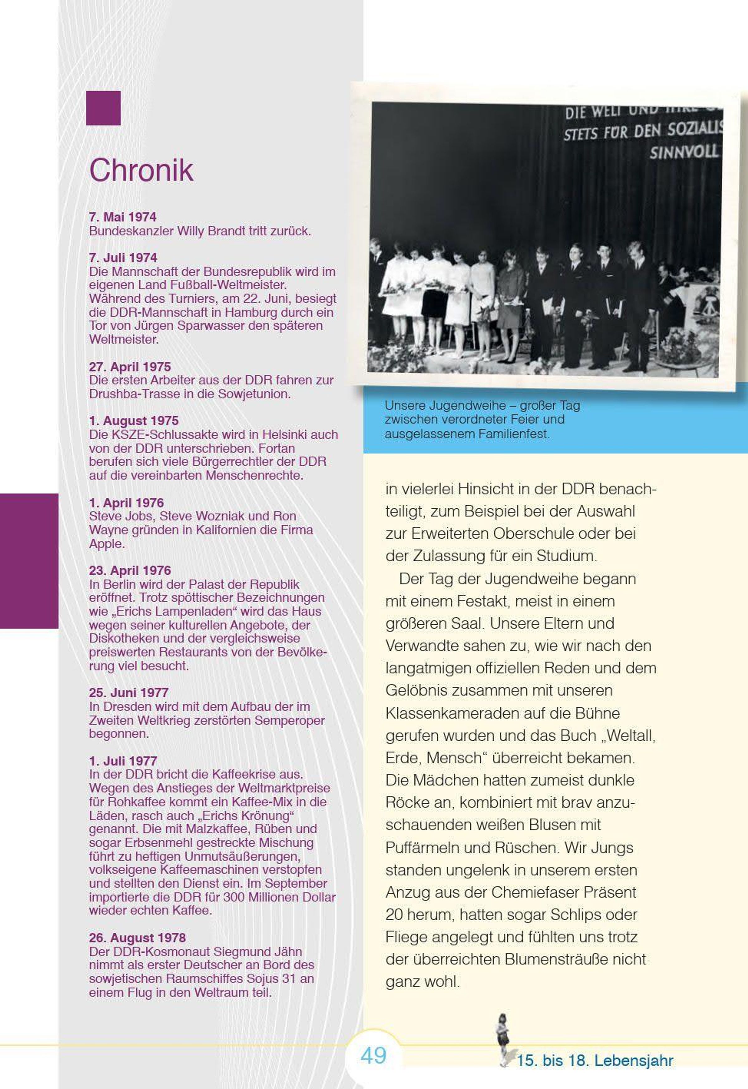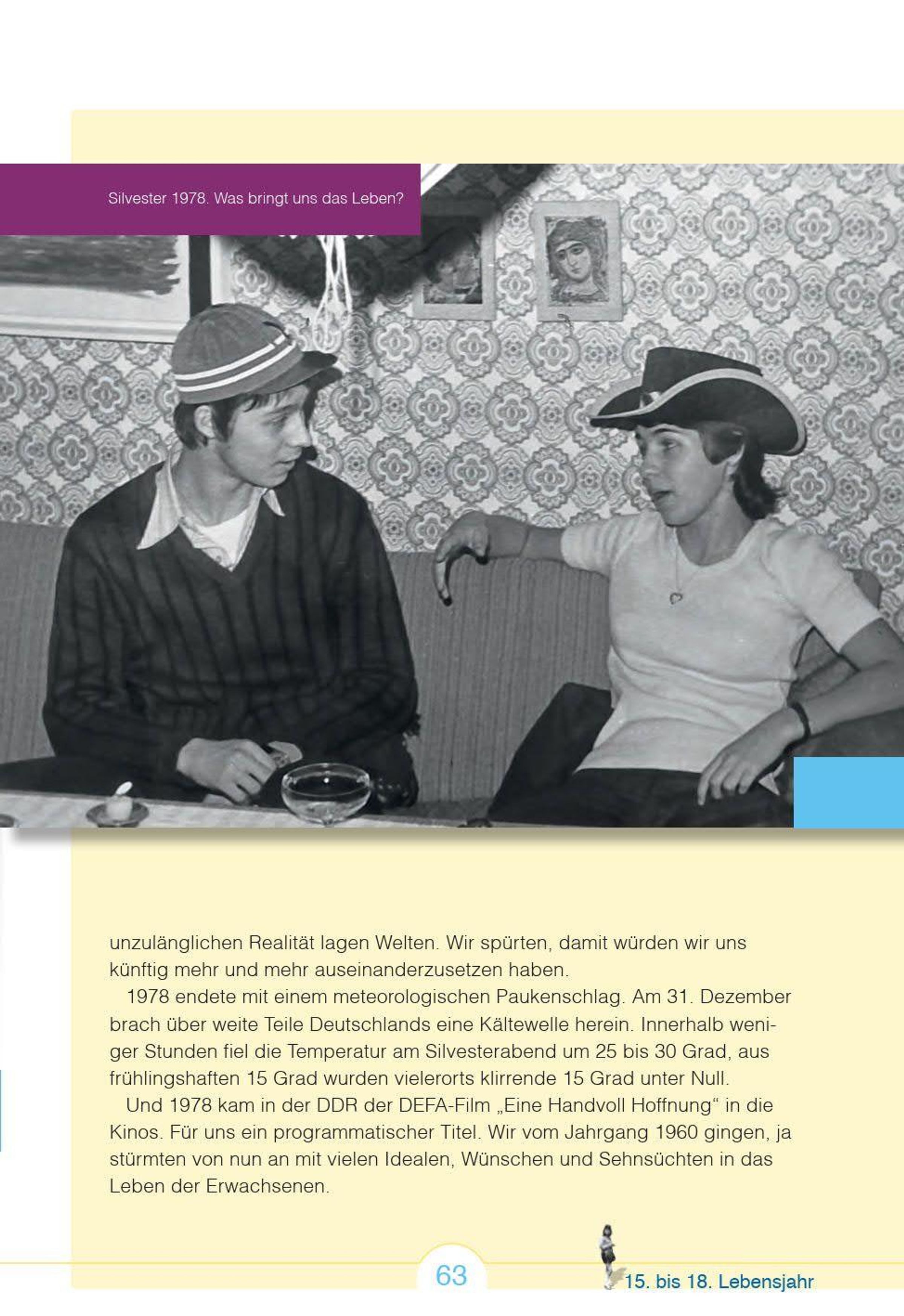 Aufgeregt und erwartungsvoll, so blickten wir damals in die Zukunft! Erinnern Sie sich mit uns an die ersten 18 Lebensjahre - an Ihre Kindheit und Jugend! Jahrgang 1960 - das ist die Generation, die ihren Alltag in der DDR lebte und mit einem Auge in den Westen schielte. Als Winzlinge wurden wir mit Elasan gesalbt und unsere ersten Helden waren Bummi und Meister Nadelöhr. Später waren Original-Jeans aus dem Westen ein Muss für uns. Je älter wir wurden, desto stärker erlebten wir die Widersprüche in unserem Staat. Und als wir 18 Jahre alt wurden, stürmten wir mit vielen Idealen, Wünschen und Sehnsüchten in das Leben der Erwachsenen.