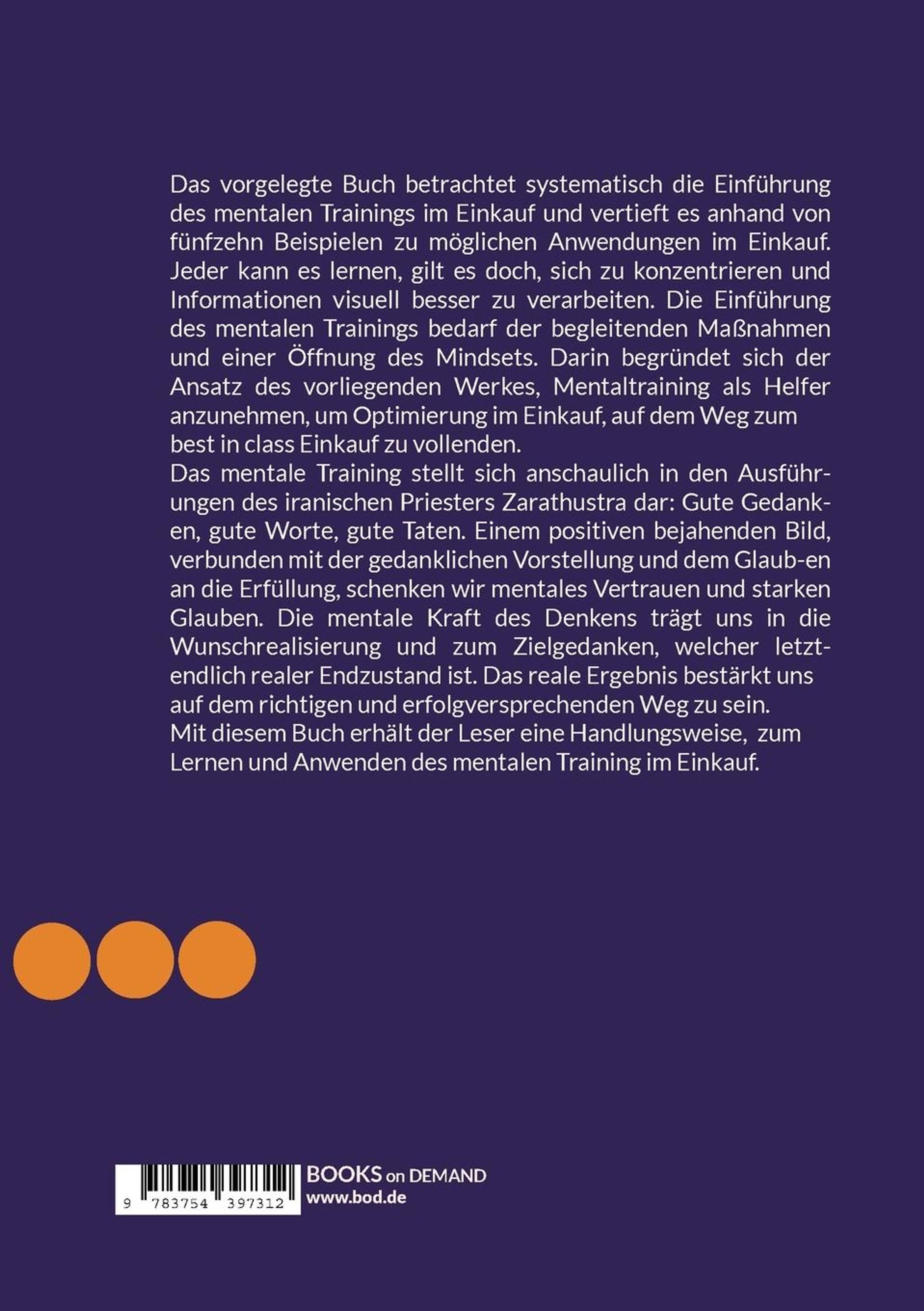 Mit der Liste der ausgewählten Einkaufsbeispiele erhalten Sie eine Vorschlagsliste zur Optimierung und dem Anwenden des mentalen Trainings. Die Auswahl besteht aus 31 Vorschlägen zum Einkauf. Fünfzehn Einkaufsbeispiele wurden mittels einer entwickelten Syntax vertiefend ausgeführt, um den Ansatz des Arbeitens im Einkauf unter der Zuhilfenahme von mentalem Training zu verdeutlichen. Mit diesem Buch erhält der Leser einen Handlungsweg, welcher nicht allgemein das mentale Training im Einkauf beschreibt