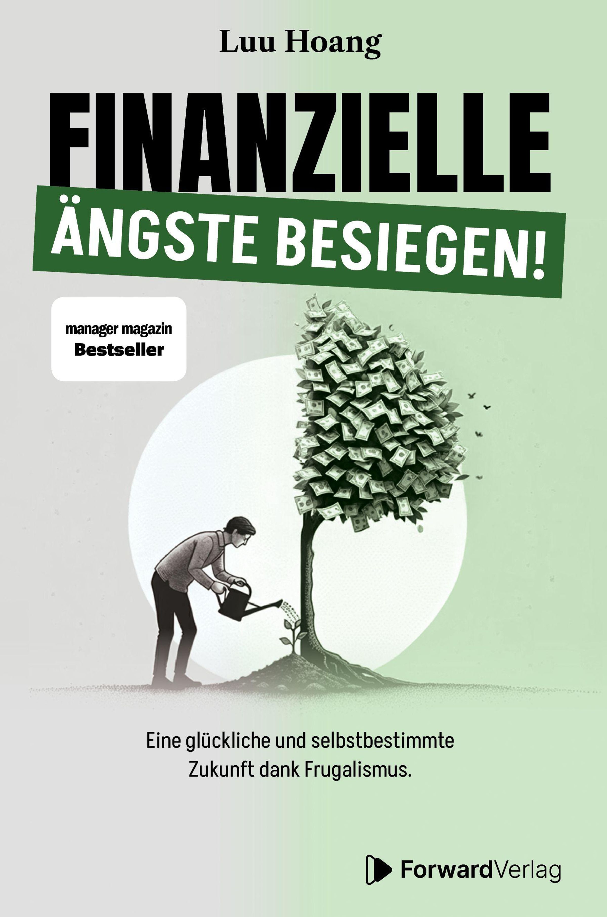 FINANZIELLE ÄNGSTE BESIEGEN! Mann gießt Geldbaum. Untertitel über Frugalismus. ForwardVerlag Logo unten., Buch