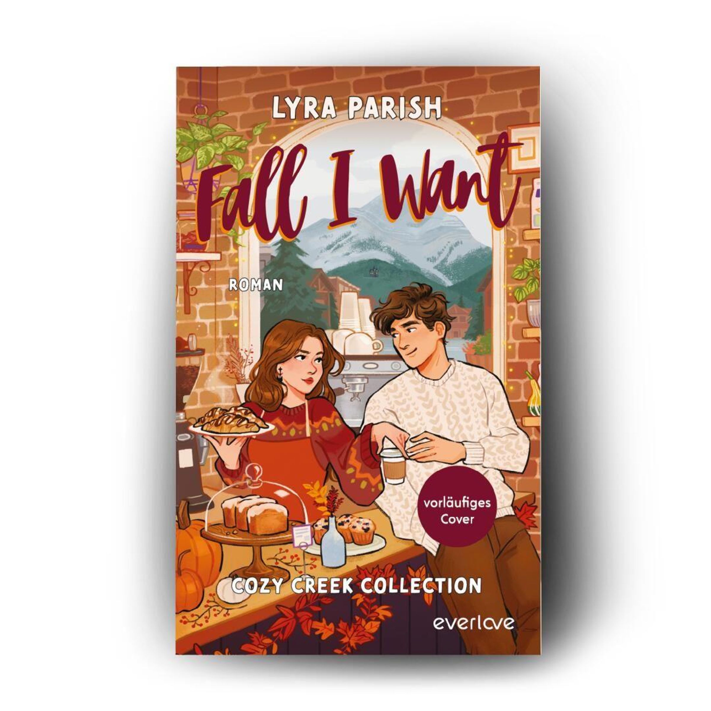 Der Text lautet: "LYRA PARISH, Fall I Want, Roman, Cozy Creek Collection, vorläufiges Cover, everlove." Illustration eines Paares im Café., Buch