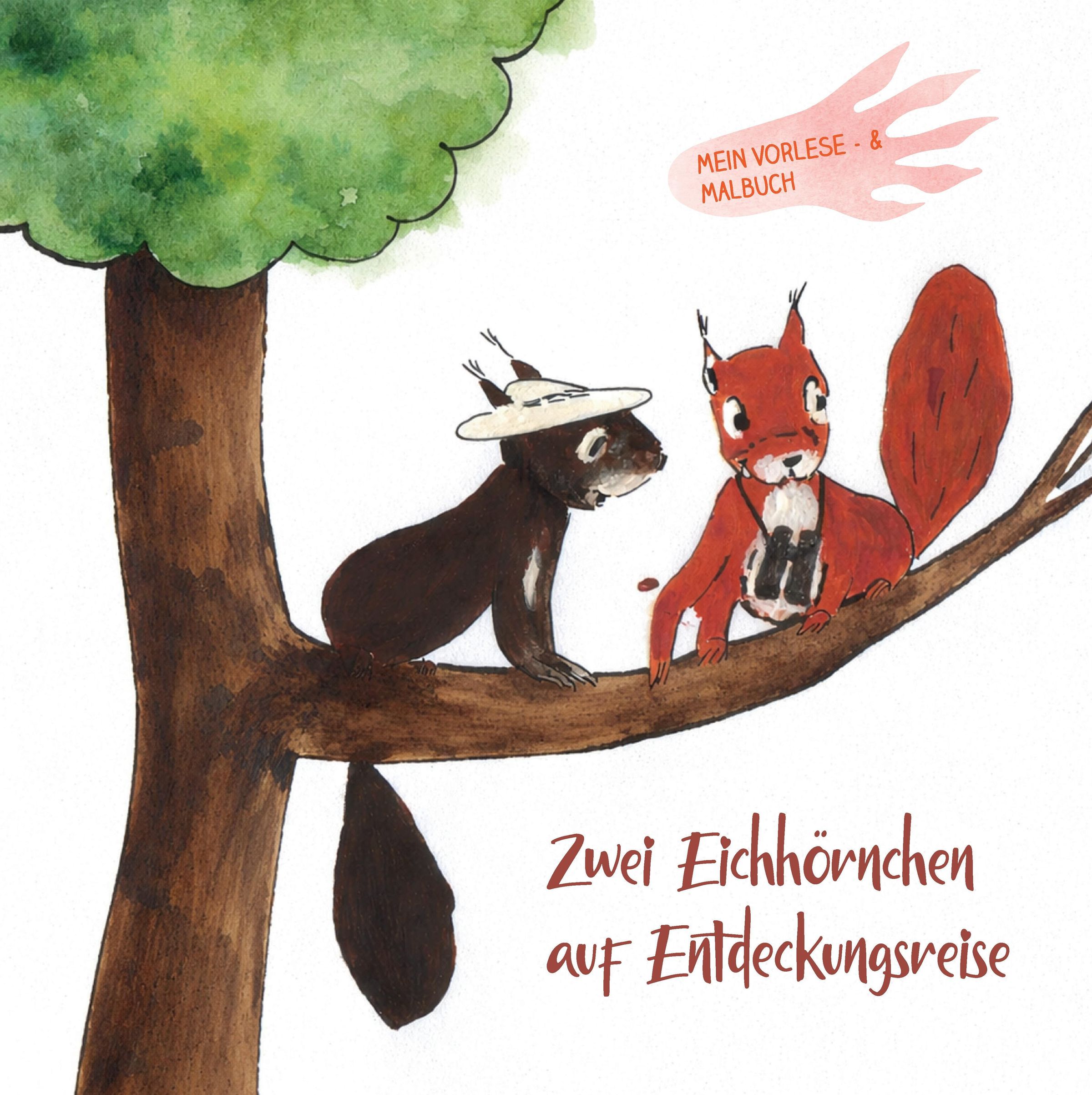 Text: "Zwei Eichhörnchen auf Entdeckungsreise". Zwei Eichhörnchen auf einem Baum, eines mit Hut, das andere mit Fernglas., Buch