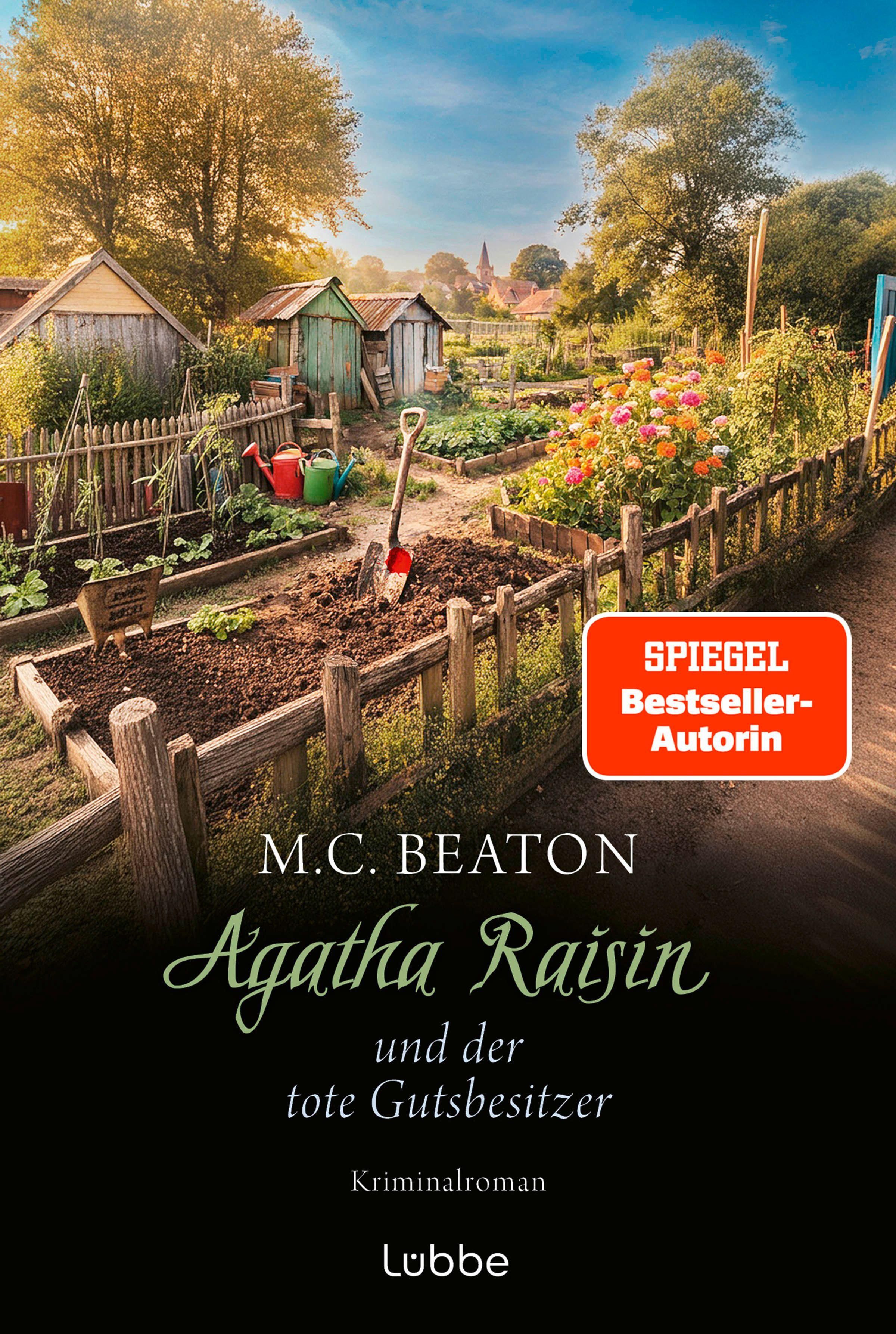 „M.C. Beaton Agatha Raisin und der tote Gutsbesitzer Kriminalroman“. Garten mit Blumen, Schuppen und Dorf im Hintergrund., Buch