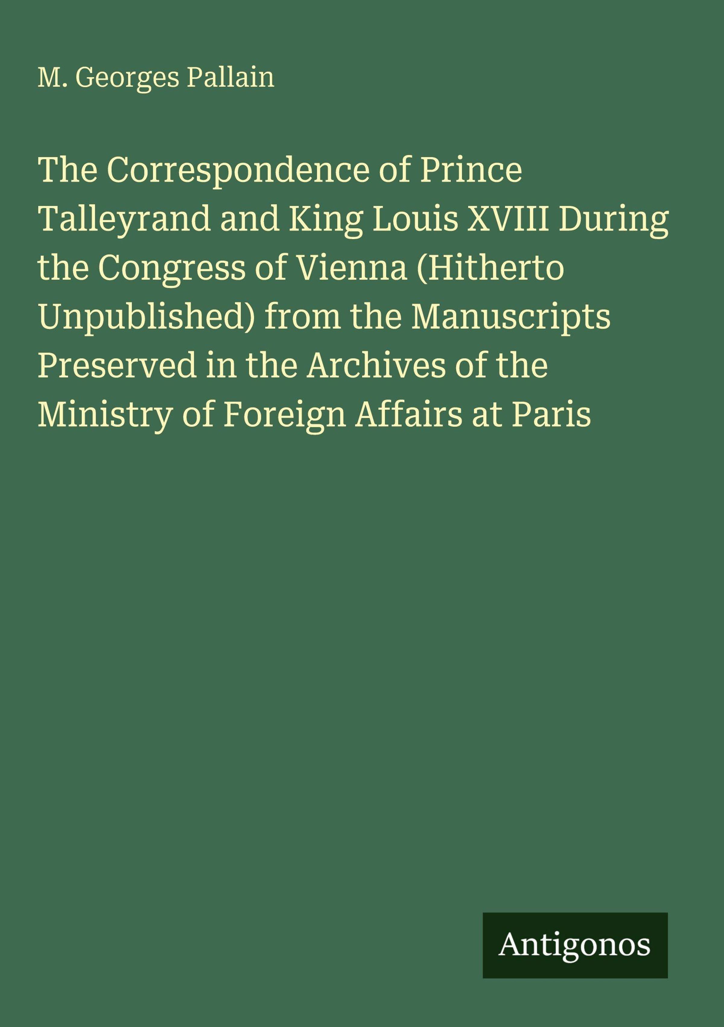 The Correspondence of Prince Talleyrand and King Louis XVIII During the Congress of Vienna (Hitherto Unpublished) from the Manuscripts Preserved in the Archives of the Ministry of Foreign Affairs at Paris