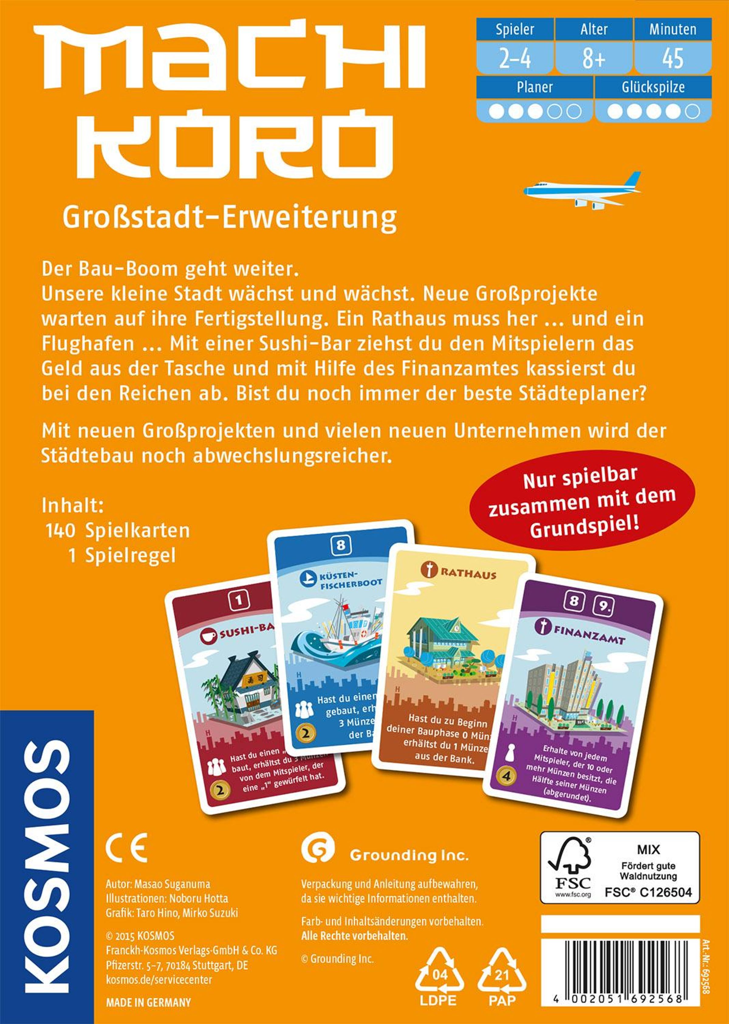 Der Bauboom geht weiter - die Großstadt-Erweiterung zum "Spiel des Jahres 2015" nominierten Spiel "Machi Koro". Gleicher Spielspaß mit mehr Tiefgang. Der Bau-Boom geht weiter! Unsere kleine Stadt wächst und wächst. Neue Großprojekte warten auf ihre Fertigstellung. Ein Rathaus muss her. und ein Flughafen. Mit einer Sushi-Bar wird den Mitspielern das Geld aus der Tasche gezogen und mit Hilfe des Finanzamtes wird bei den Reichen abkassiert. Wer ist nun der beste Städteplaner? Mit 3 neuen Großprojekten und 23 neuen Unternehmen. Durch die neuen Karten wird das beliebte Grundspiel auf charmante Weise erweitert. Es entstehen immer wieder neue Spielsituationen und Möglichkeiten. Kein Spiel gleicht dem anderen. Nur in Verbindung mit dem Grundspiel spielbar. Für 2 - 4 Spieler ab 8 Jahren. Spieldauer: ca. 40 Minuten.