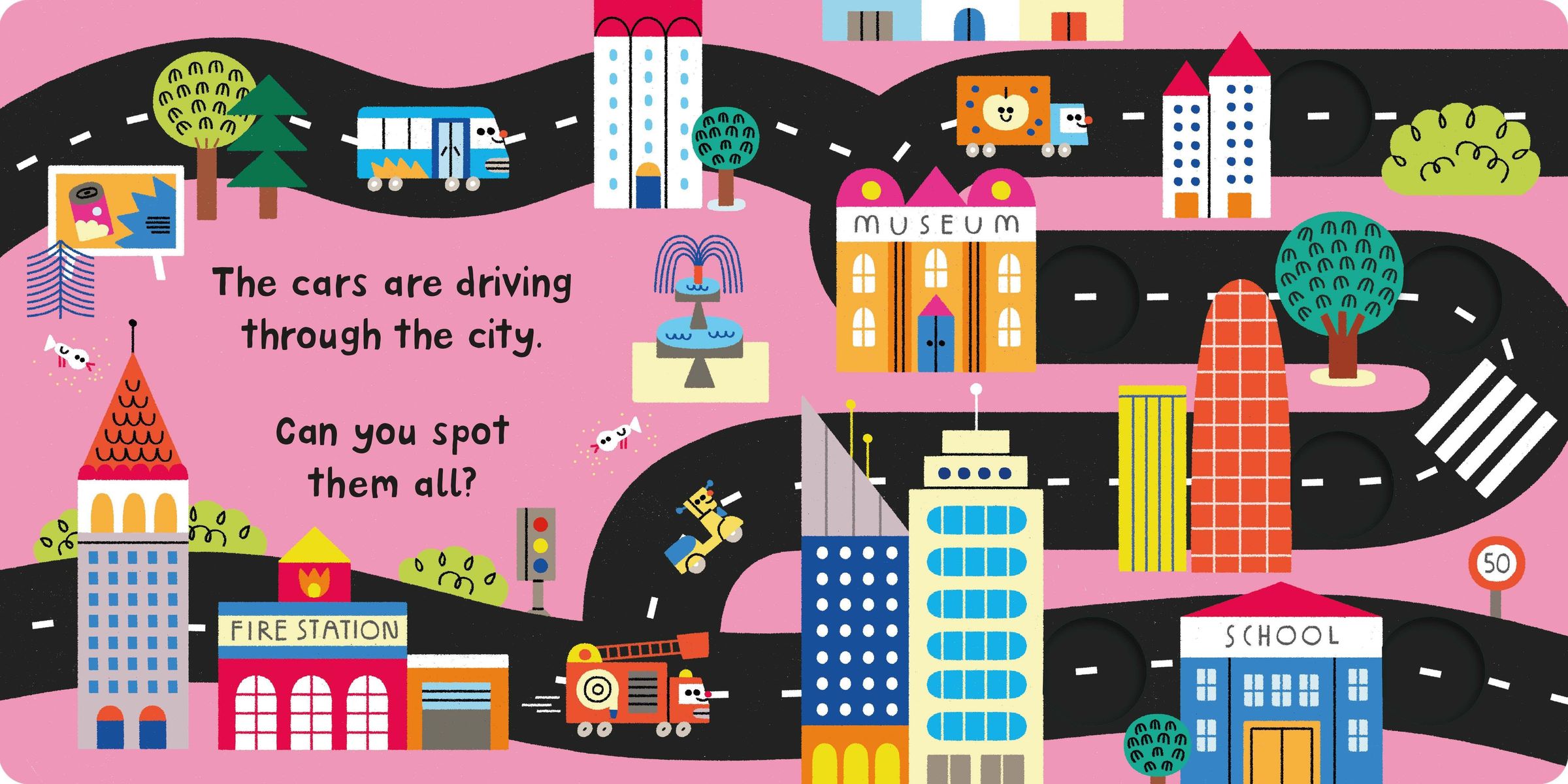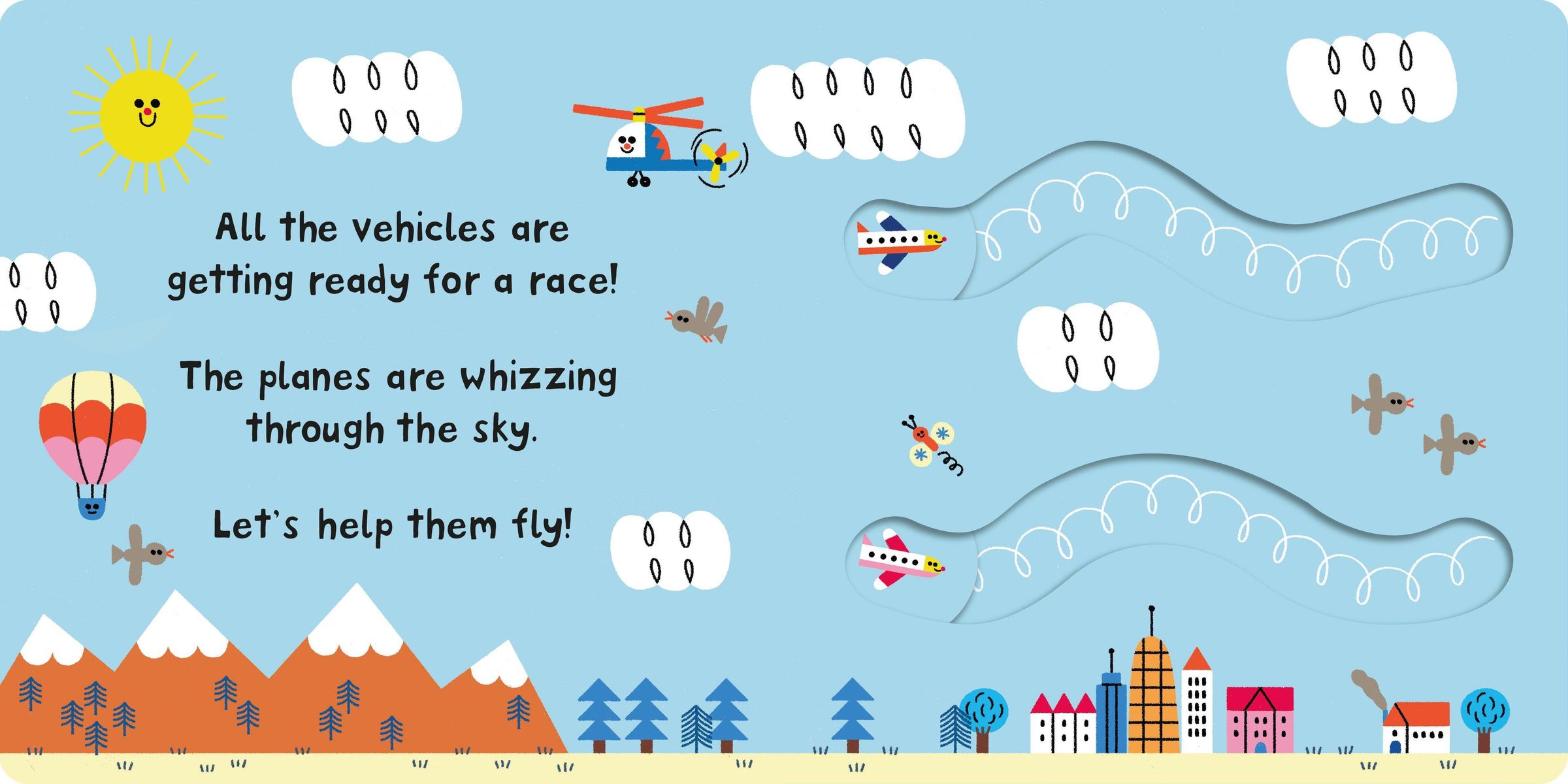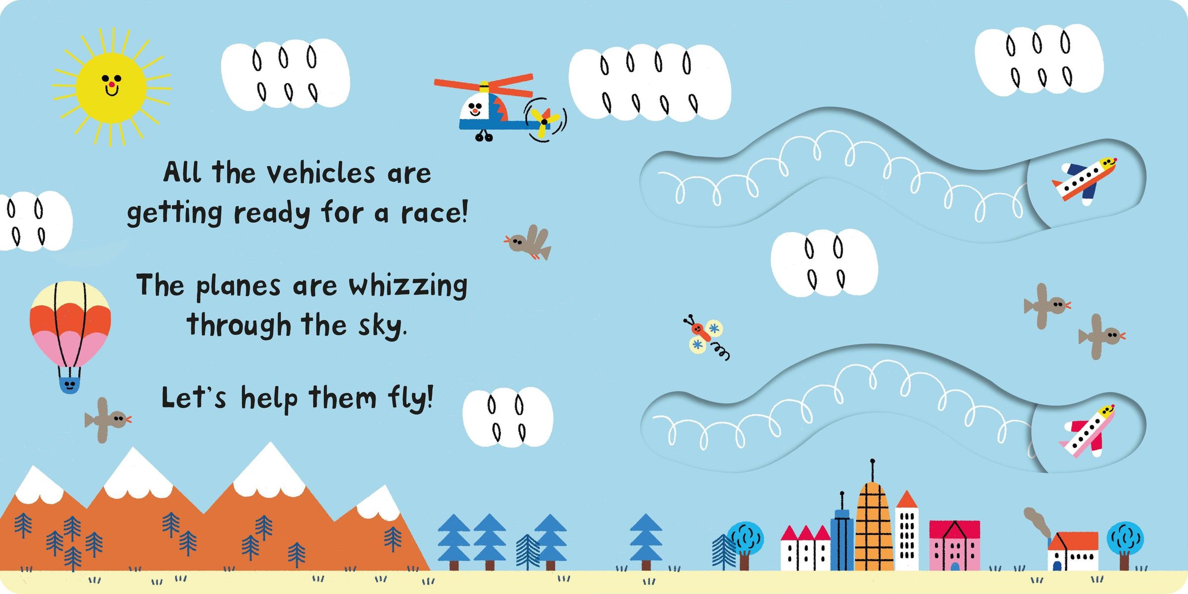 Tilt the book to make the vehicles race across the page with this interactive slider book. Are you ready to join in the fun? Ready . . . steady . . . RACE!