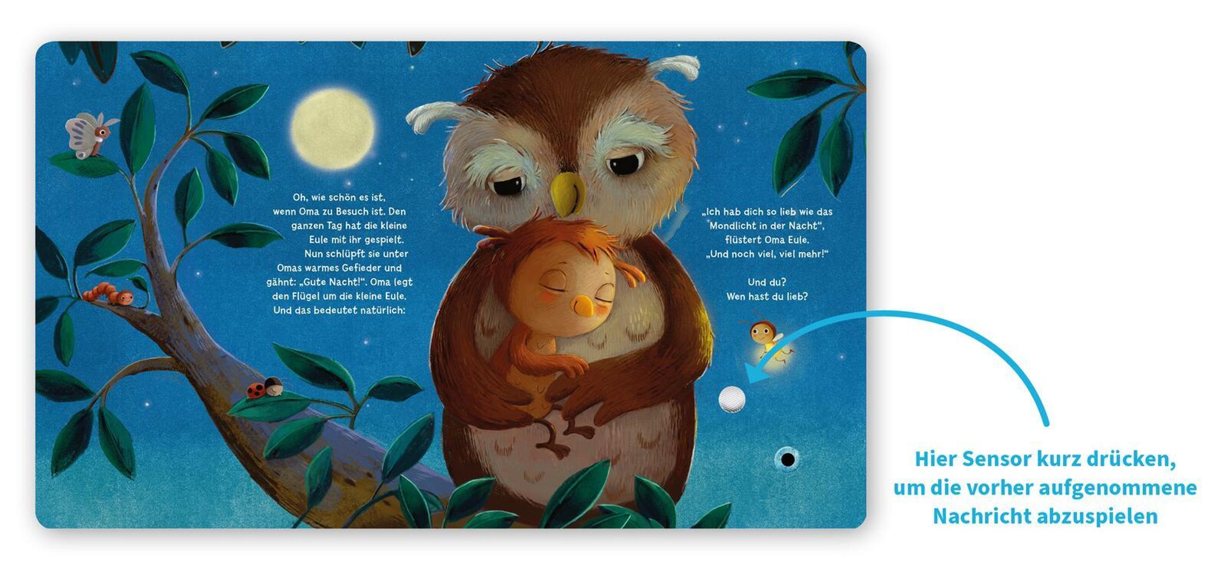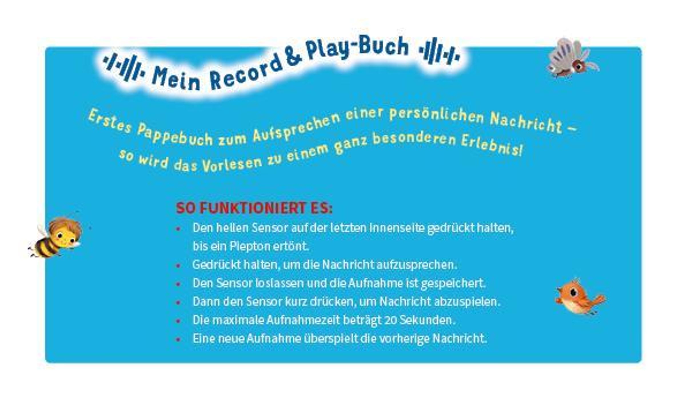 Dieses Pappebuch kann mehr als nur eine Geschichte erzählen: Dank der Aufnahmefunktion auf der letzten Innenseite lassen sich Lieblingsworte, Gutenacht- oder eine ganz persönliche Liebeserklärung direkt ins Buch sprechen. Ein besonderes Geschenk, das tröstet, Freude bereitet und immer wieder mit einer neuen Botschaft überspielt werden kann.