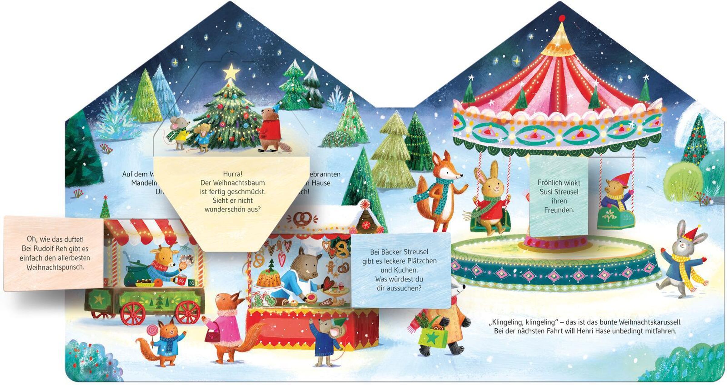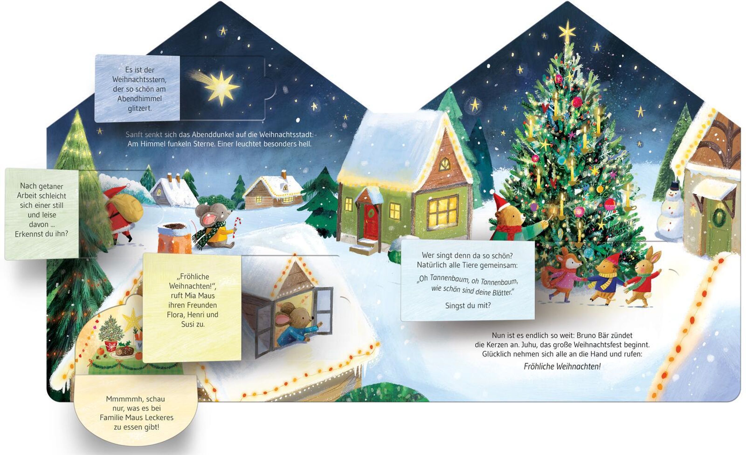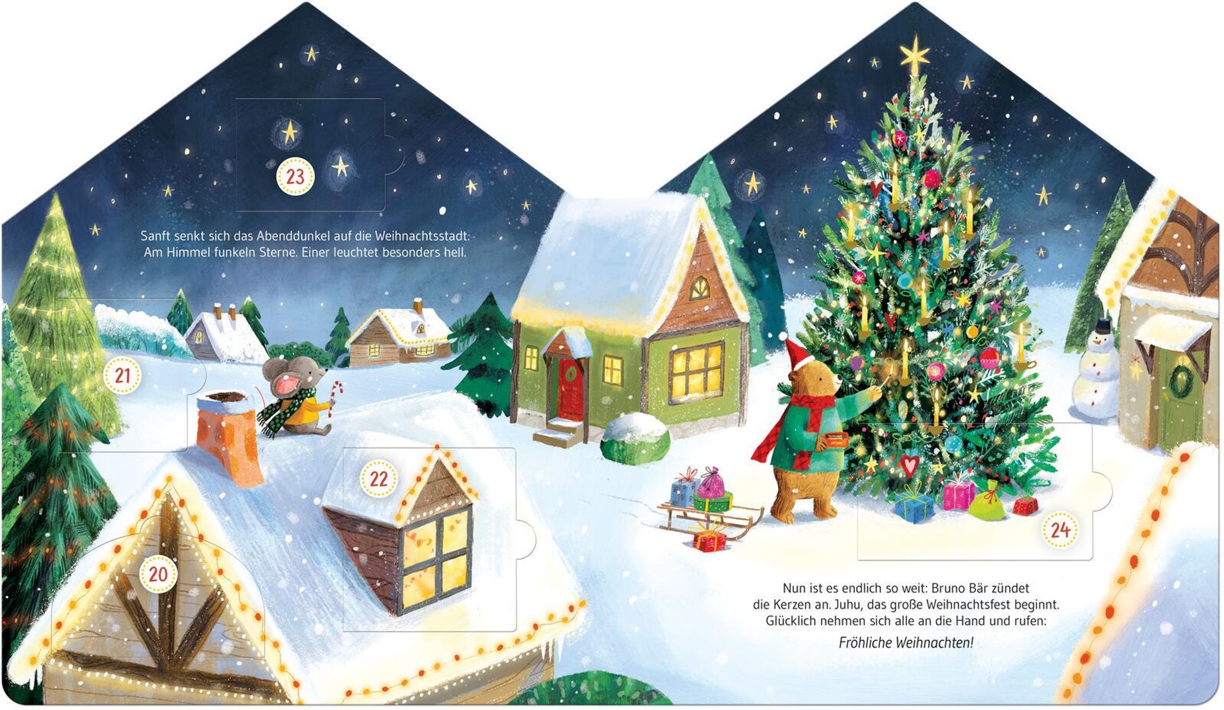 - zauberhaft illustriert Hier darf man, was ansonsten vor Weihnachten streng verboten ist: hinter alle Türen und Fenster schauen! Denn 24 zauberhafte Überraschungen verkürzen für Kinder ab 1 Jahr die Wartezeit bis zum schönsten Fest des Jahres. Was gibt es bei Familie Fuchs zum Frühstück? Wovon träumt Oma Dachs? Was hängen die Hasenkinder an ihren Weihnachtsbaum? Und was mag Schönes in den bunten Päckchen stecken? In der kleinen Weihnachtsstadt lassen sich unzählige niedliche Details und liebevolle Weihnachtsgeheimnisse entdecken.