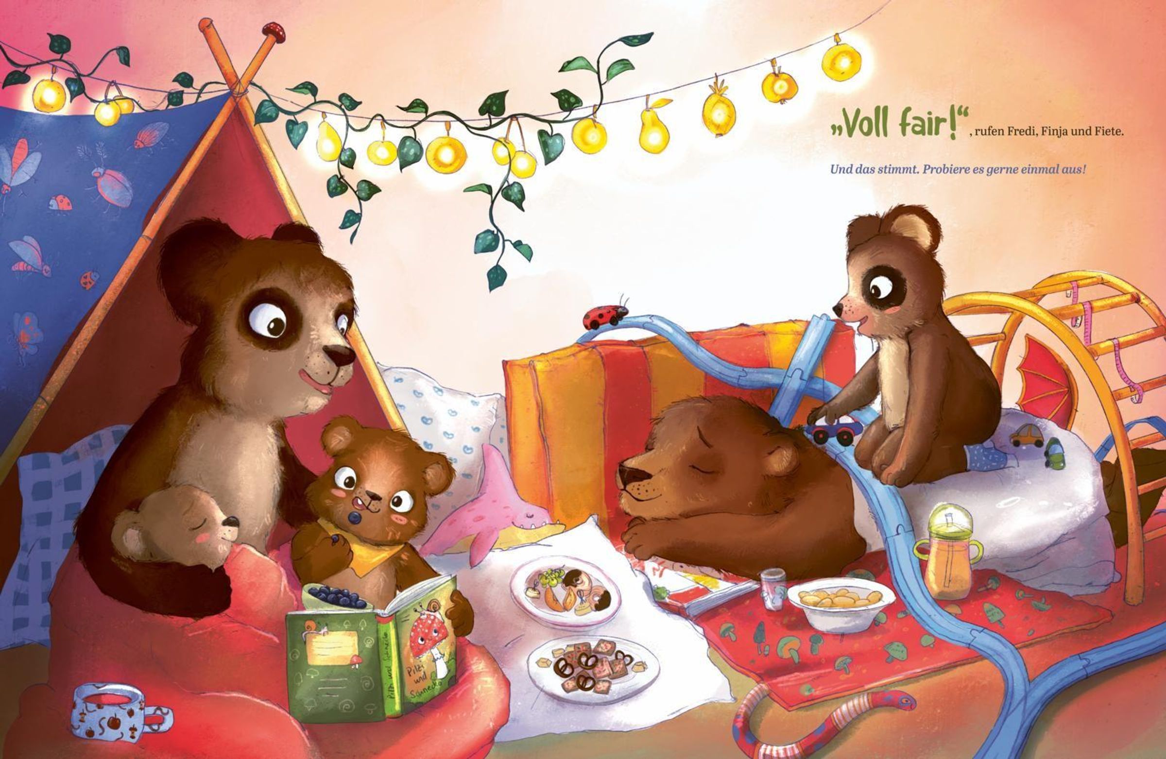 Bei Familie Bär gibt es ständig Streit: Fredi, Finja und Fiete finden alles voll unfair! Nie gibt es Finjas Lieblingsessen, Mama spielt immer nur mit Fredi und wieso darf eigentlich Fiete auf Papas Schultern reiten? Im Familienrat beschließen sie, dass ab jetzt alles voll fair wird! Das heißt: Es gibt nur noch Nudeln ohne Soße, alle quetschen sich im Auto auf einen Platz und der Kuchen wird mit dem Lineal vermessen. So ist es doch jetzt voll fair! Aber leider ist damit auch niemand glücklich ... Zum Glück findet Familie Bär am Ende noch eine andere Lösung: Echte Fairness ist eben nicht, wenn für alle das Gleiche gilt, sondern wenn alle sagen dürfen, was sie brauchen, und dann jeder mal dran ist.