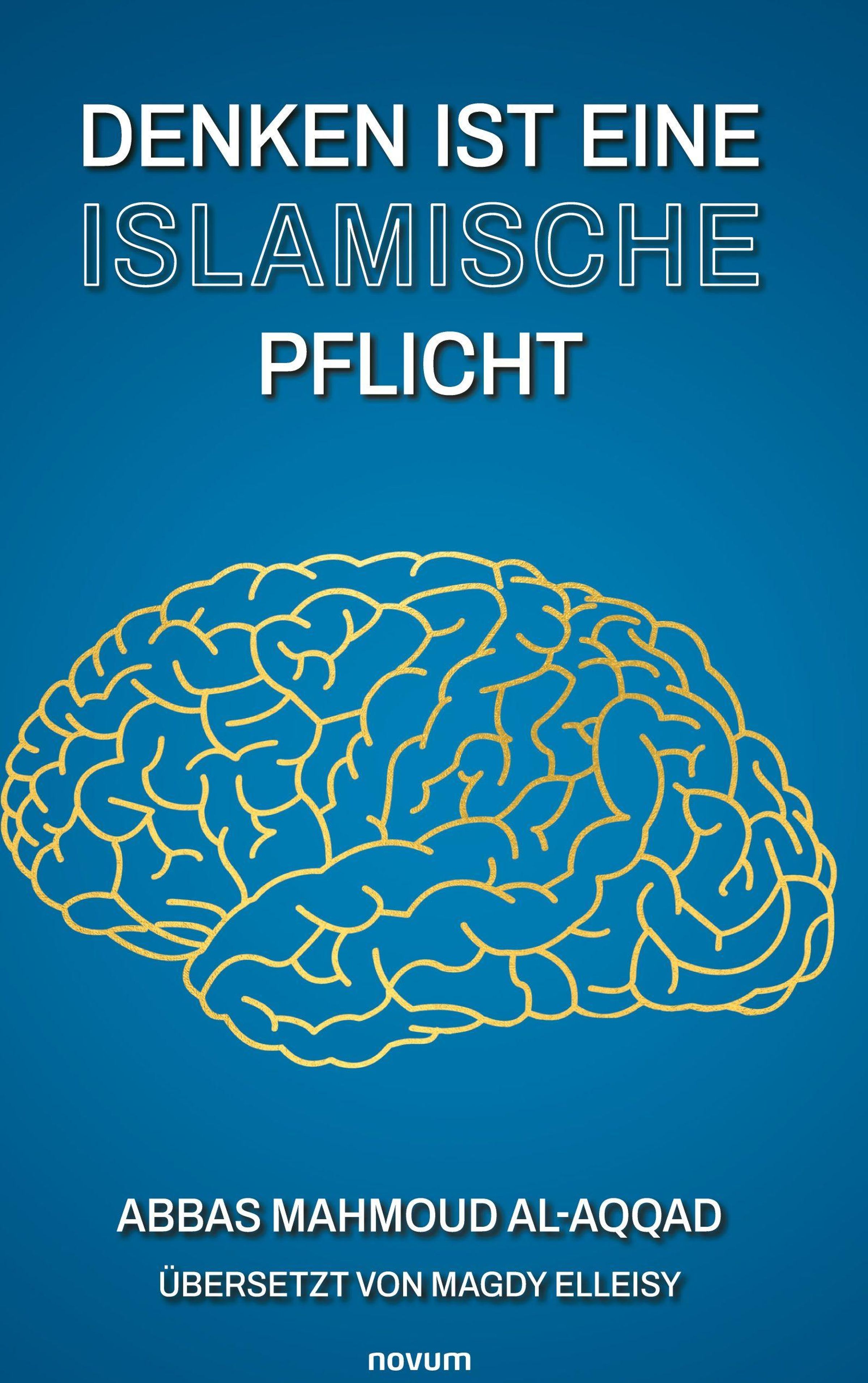 "Denken ist eine islamische Pflicht. Abbas Mahmoud Al-Aqqad, übersetzt von Magdy Elleisy. Goldene Gehirnzeichnung auf blau.", Buch