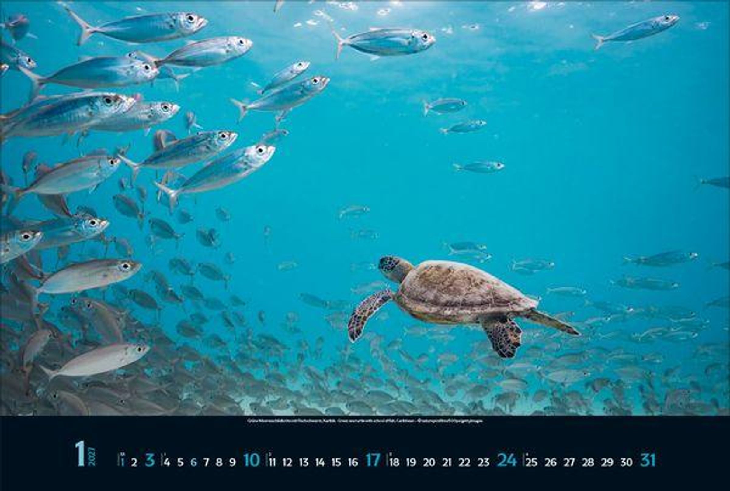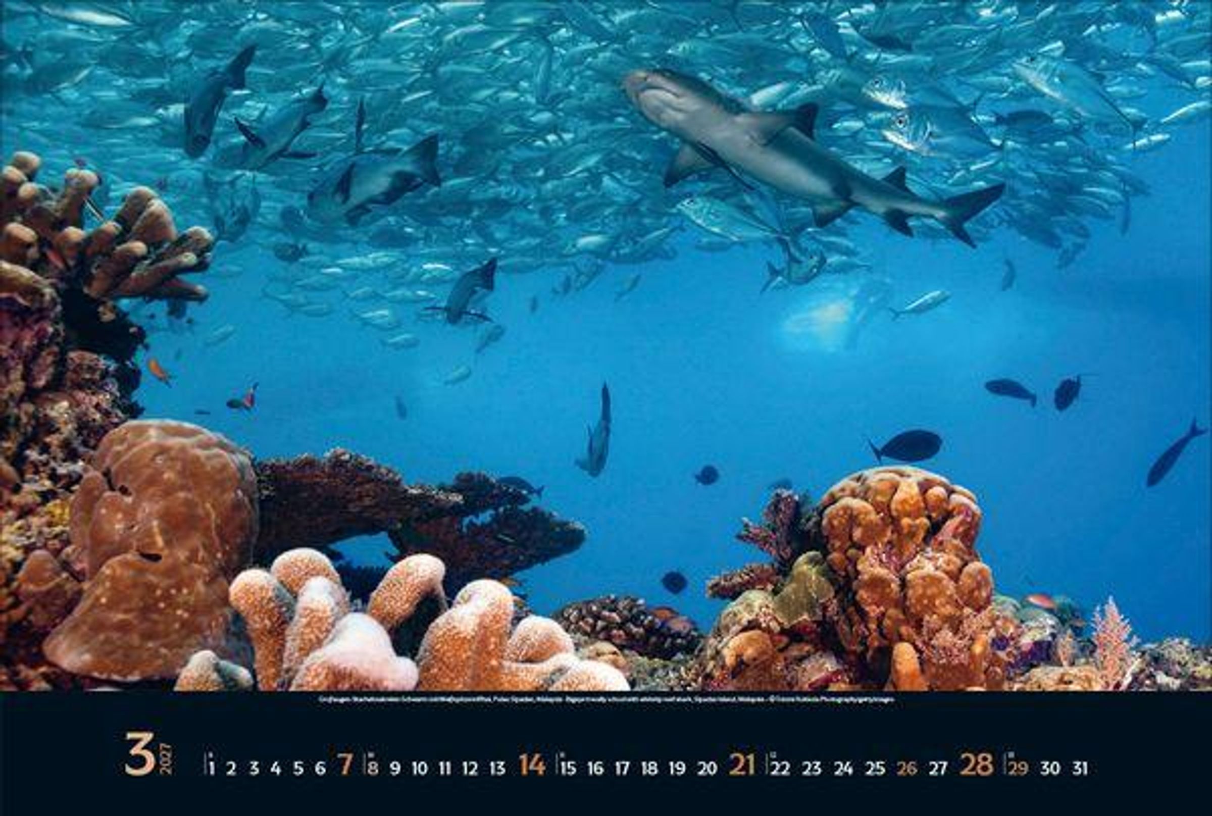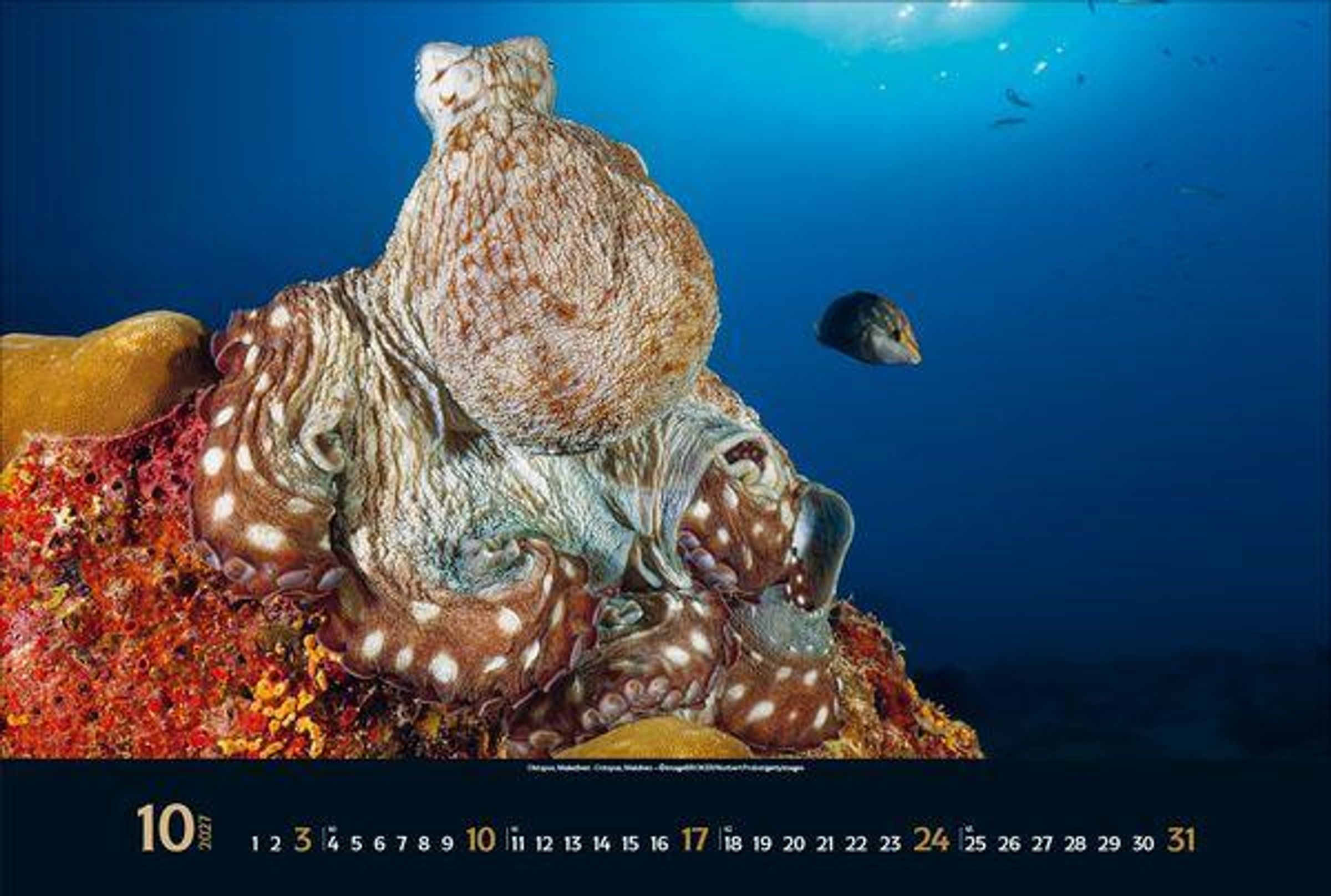 Gigantische Fischschwärme, geheimnisvolle Kraken, schwebende Rochen - die bunte Unterwasserwelt der Meere ist voller einzigartiger Lebewesen, die uns faszinieren. Tauchen Sie ein und genießen Sie jeden Monat eine neue magische Aufnahme aus den Weltmeeren in brillanter Fotoqualität.