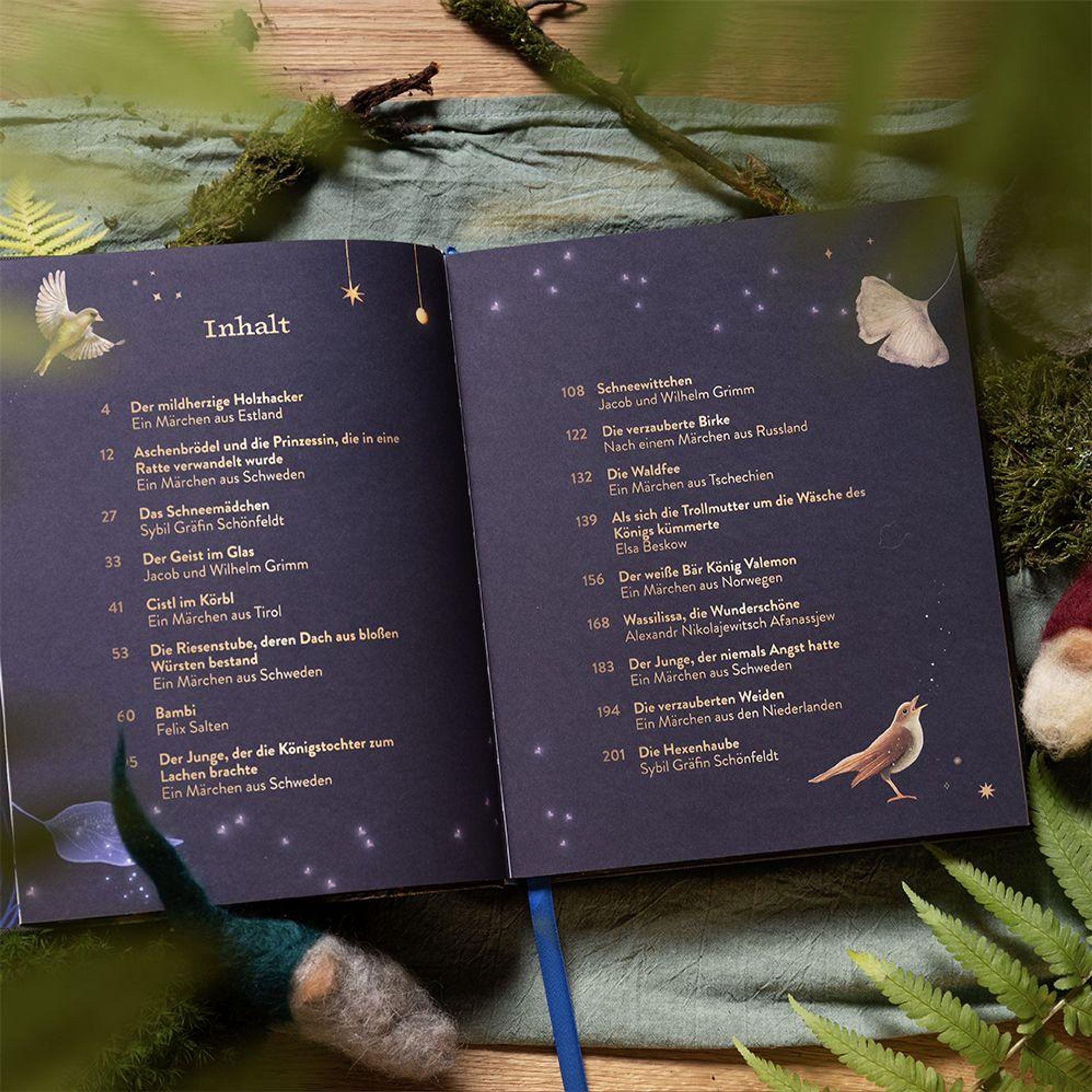 Viele besonders detailreiche Illustrationen auf jeder Seite erwecken die Erzählungen auf magische Weise zum Leben. Kunstvoll illustrierte Kapitelaufmacher und aufwändig gestaltete Schmuckseiten setzen jede der Geschichte ganz individuell in Szene und machen das Lesen zu einem außergewöhnlichen Abenteuer. Eine beidseitig aufklappbare, großflächig illustrierte Doppelseite in der Buchmitte versammelt Motive aus allen Märchen in einem großen Wald-Wimmelbild und lädt zum Schauen und Staunen ein. Der edle Einband in Leinenhaptik, der Goldschnitt und die hochwertige Goldfolienveredelung auf dem Cover machen das Buch zu einem ganz besonderen Geschenk für alle Märchenfans und Waldliebhaber - zum Vorlesen, Selbstlesen und Verschenken.