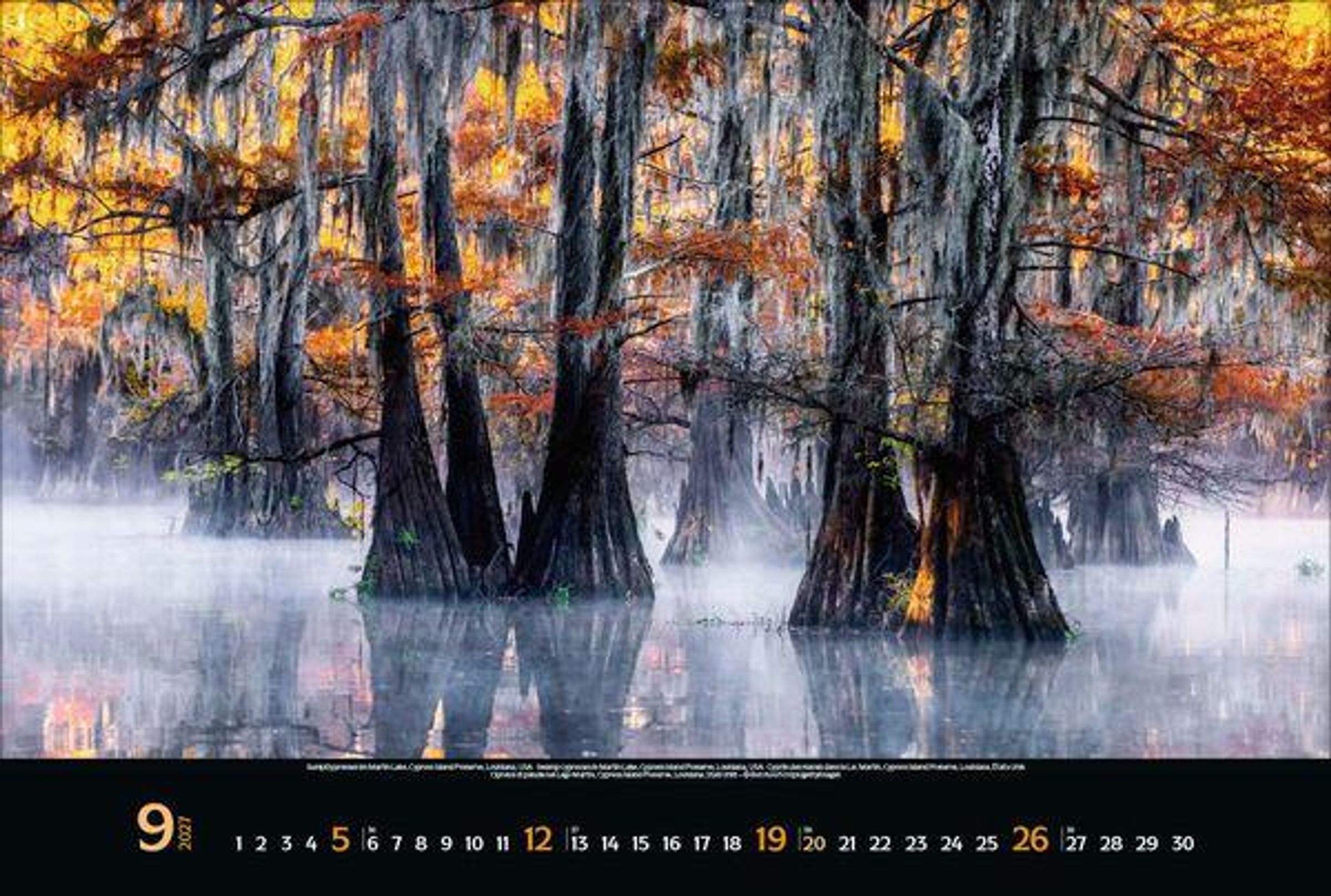 - Großer Foto-Wandkalender mit Bildern aus bunten Wäldern. Edler schwarzer Hintergrund. PhotoArt Panorama Querformat: 58x39 cm.