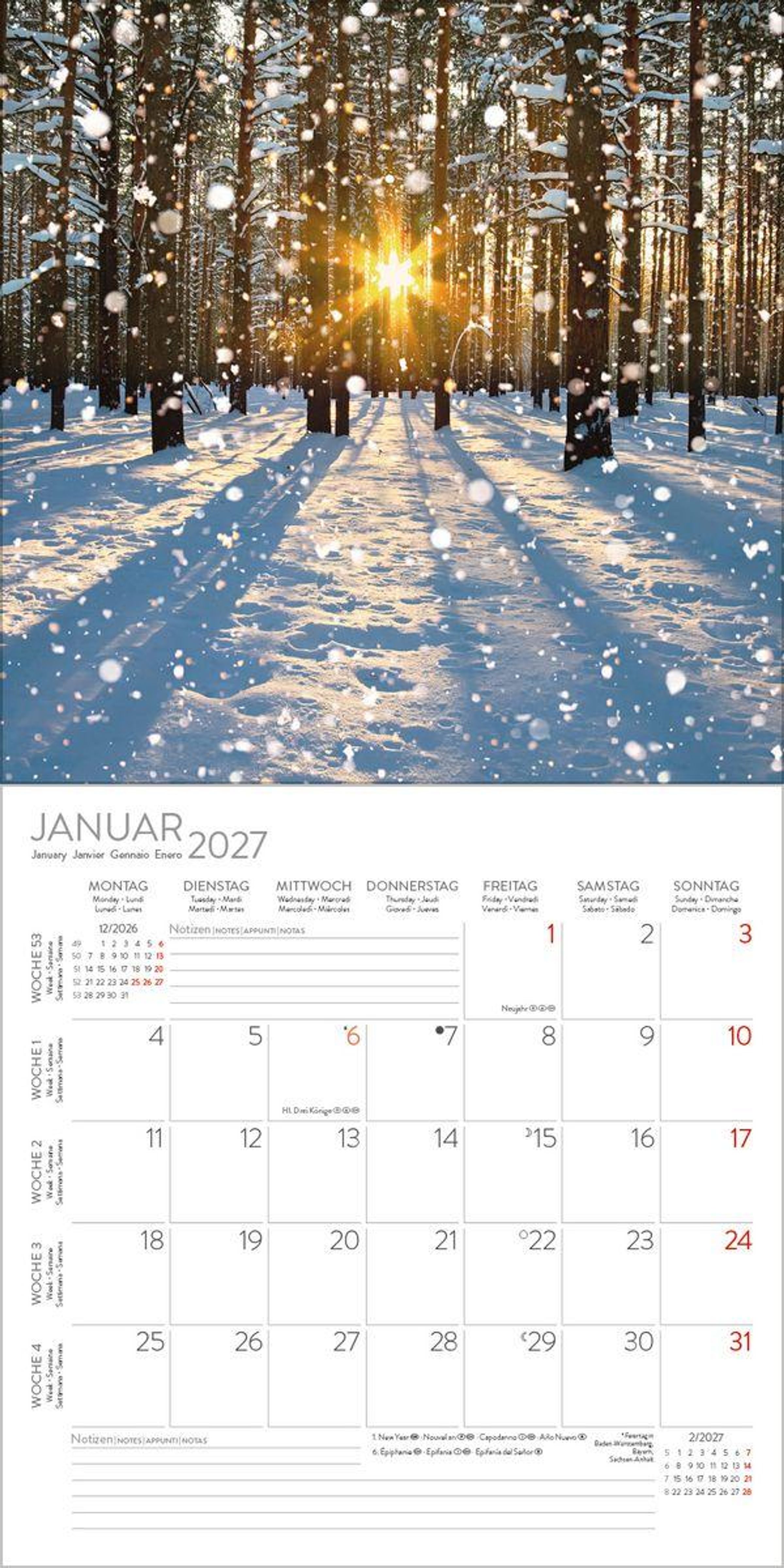 Wandkalender im Format: 30 x 30 cm; Offenes Format: 30 x 60 cm; umweltfreundliches FSC Papier Jede Kalenderseite mit großem Bild und viel Platz im Kalendarium für Notizen und Termine Mehrsprachiges Kalendarium: DE/GB/FR/IT/ES mit Feiertagen für D/A/CH/GB/FR/IT/ES Regionale Ferienzeiten für DE/A/CH Monatsübersicht für den jeweiligen Vor- und Nachmonat; Jahresübersicht