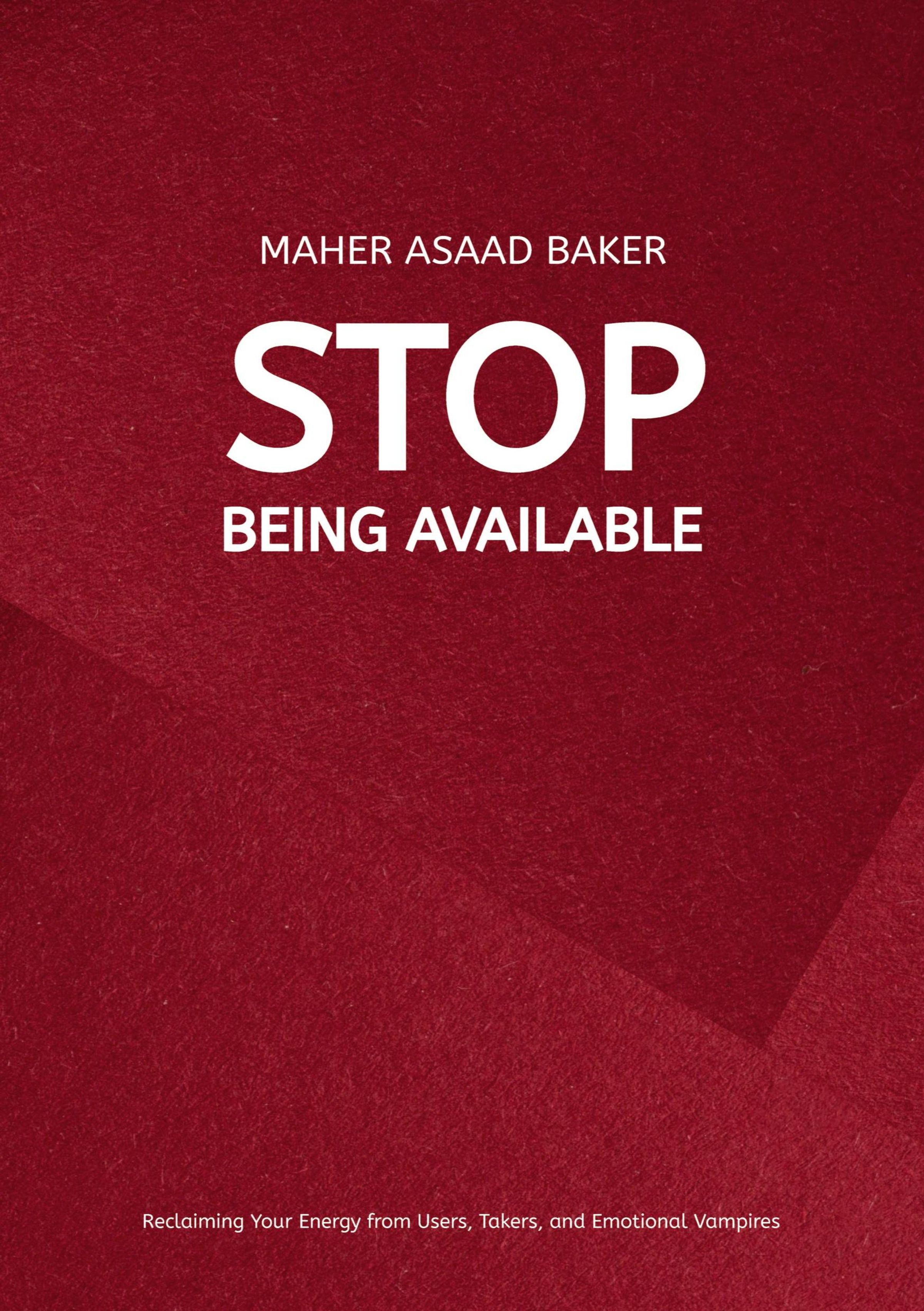Titel: "STOP BEING AVAILABLE". Autor: Maher Asaad Baker. Untertitel: Energie zurückgewinnen. Hintergrund in Rot., Buch