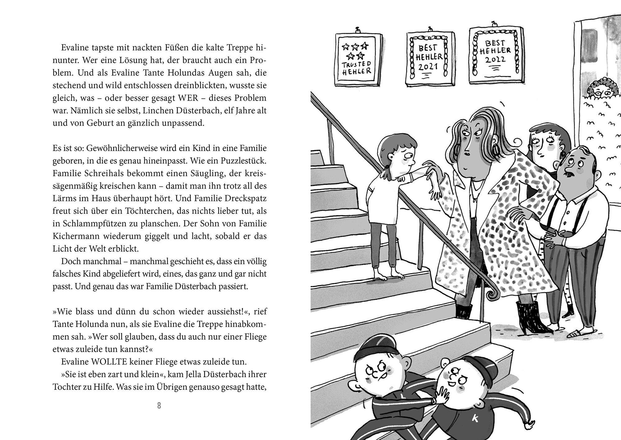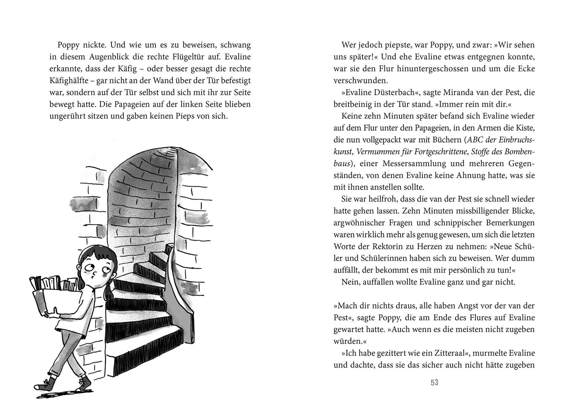Evaline Düsterbach ist freundlich, höflich und kann keiner Fliege was zuleide tun. Das alles wäre ja nicht so schlimm, wenn nicht alle anderen Familienmitglieder waschechte Autodiebe wären. Da bleibt nur eins: Evaline soll auf der Schule des abgrundtief Bösen das Zeug zu einer gewieften Verbrecherin erlernen. Doch statt beim Einbruchsklettern oder Fluchtplanschmieden zu glänzen, kommt Evaline einem Geheimnis auf die Spur, dessen Enthüllung den Ruf der Schule ein für alle Mal ruinieren könnte.