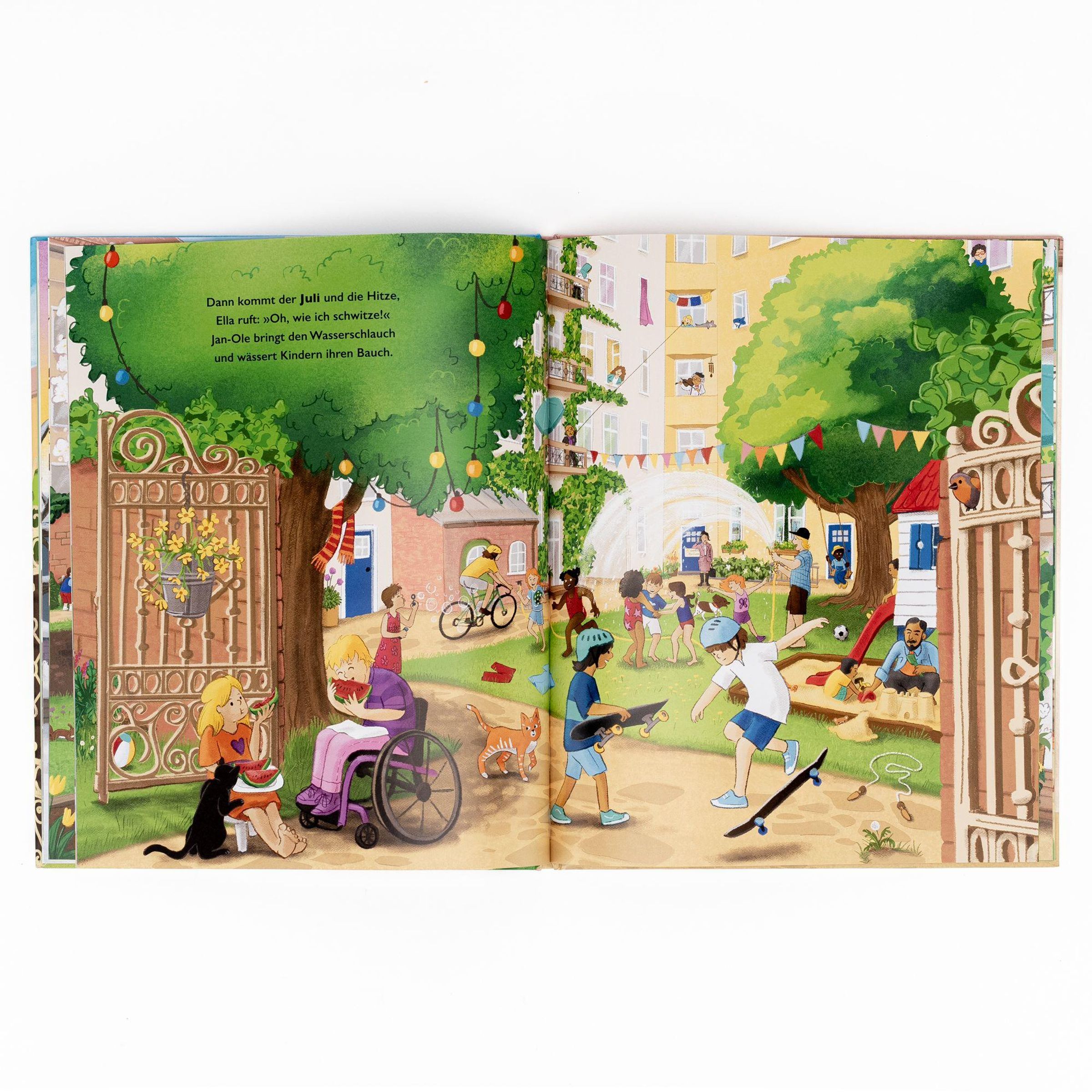 Eine Wimmelgeschichte, die viel über den Jahresverlauf und das Miteinander in einer diversen Nachbarschafterzählt