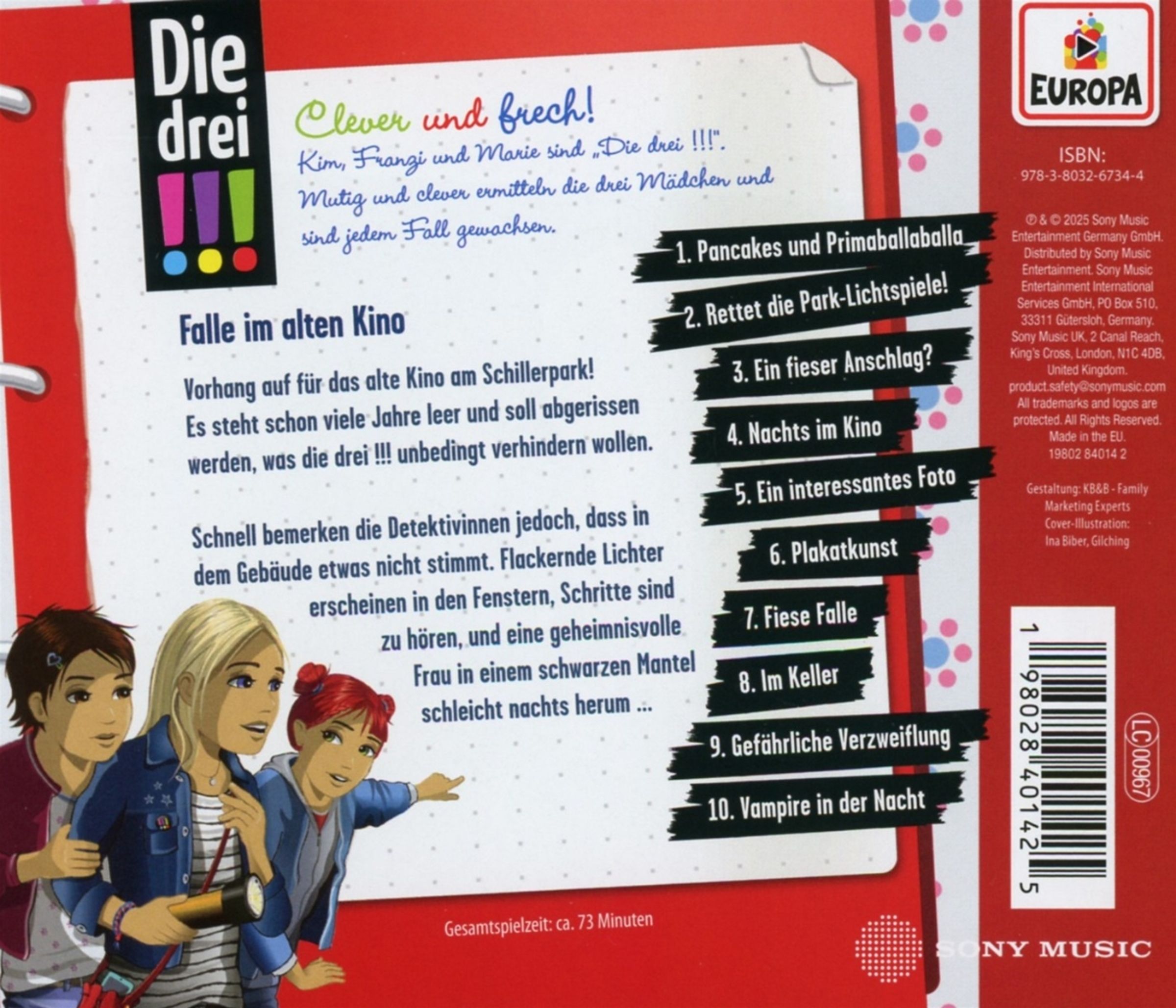 Kim, Franzi und Marie sind »Die drei !!!«. Mutig und clever ermitteln die drei Detektivinnen und sind jedem Fall gewachsen. Kim, Franzi und Marie helfen Maries Vater, Spenden für ein altes Kino zu sammeln, das abgerissen werden soll. Während der Rettungsaktion beobachten die Freundinnen allerlei Merkwürdiges in dem geschichtsträchtigen Gebäude. Spukt es dort etwa? Natürlich müssen die Detektivinnen sich das bei Nacht genauer ansehen...