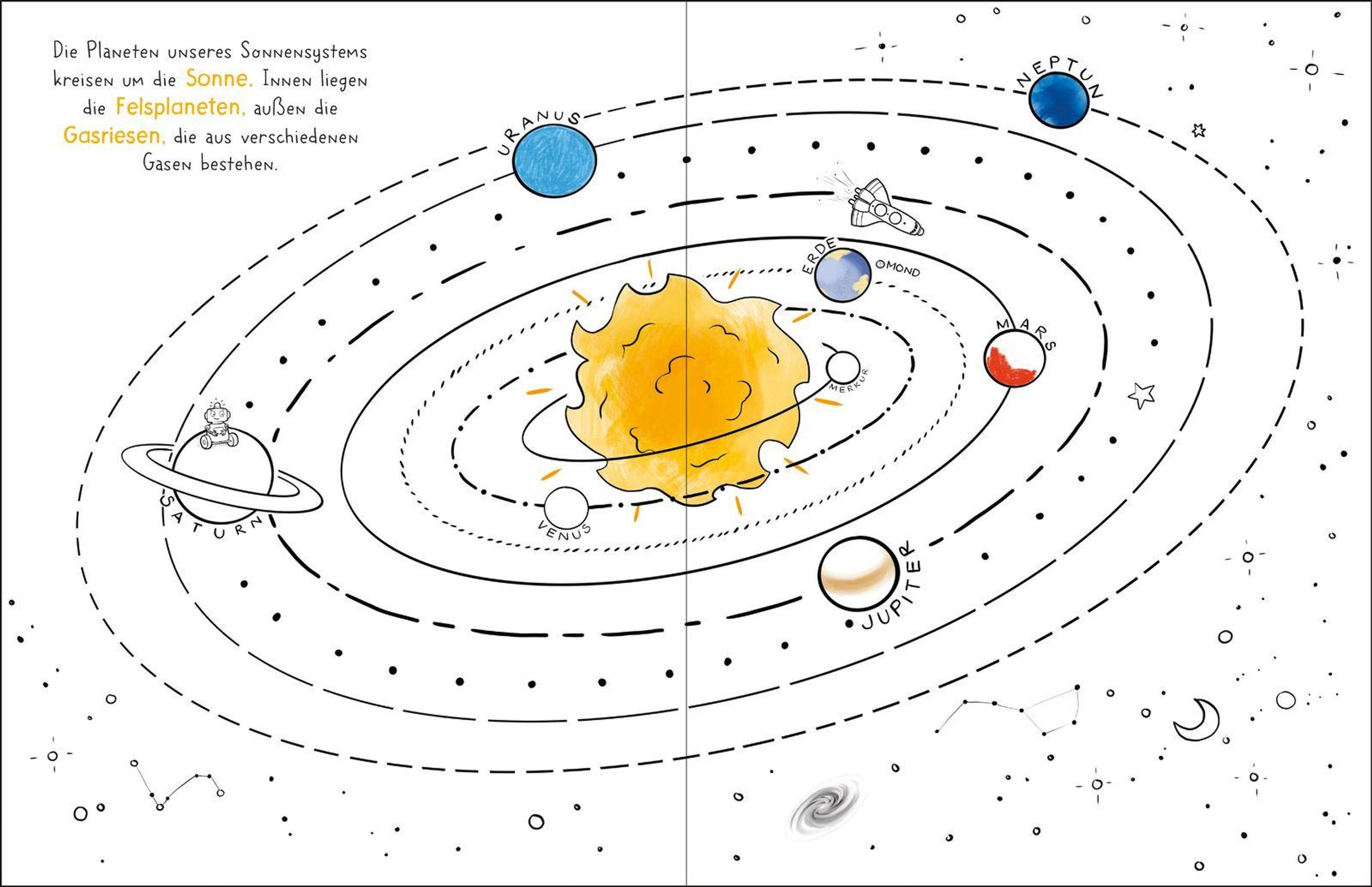 Dieses liebevoll gestaltete Ausmalbuch nimmt angehende Weltraumforscher ab 5 Jahren mit auf eine Reise in unser faszinierendes und wundersames Universum. Eine spannende Geschichte führt die kleinen Künstler*innen auf eine Reise durch die Milchstraße und darüber hinaus, wobei unser Sonnensystem erkundet und viele Planeten besucht werden. Zahlreiche kreative Ideen laden zum Ausmalen, Weitermalen und Kritzeln von Sternen, Monden und Raumschiffen ein. Zwischen Sternen und schwarzen Löchern sorgen kleine Suchelemente für zusätzlichen Spaß und Abwechslung. Und ganz nebenbei werden spielerisch spannende Infos zu Weltall und Raumfahrt vermittelt.