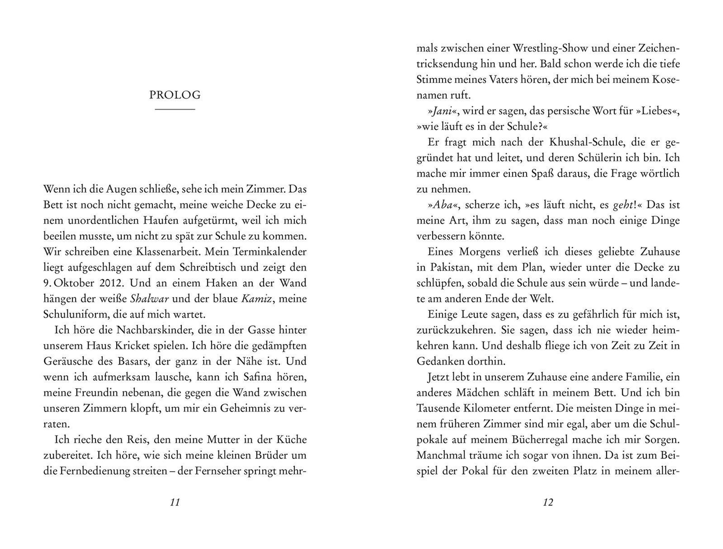 Malala Yousafzai, geboren 1997, wurde von klein auf von ihrem Vater Ziauddin gefördert und dazu ermutigt, sich für die Rechte von Mädchen einzusetzen. Ziauddin Yousafzai leitete selbst eine Schule im pakistanischen Swat-Tal und missachtete damit das Verbot der Taliban. Malala lebt heute mit ihrer Familie in England, wo sie sich von ihren schweren Verletzungen erholt. Seit März 2013 geht sie in Birmingham wieder zur Schule.Anmerkungen: