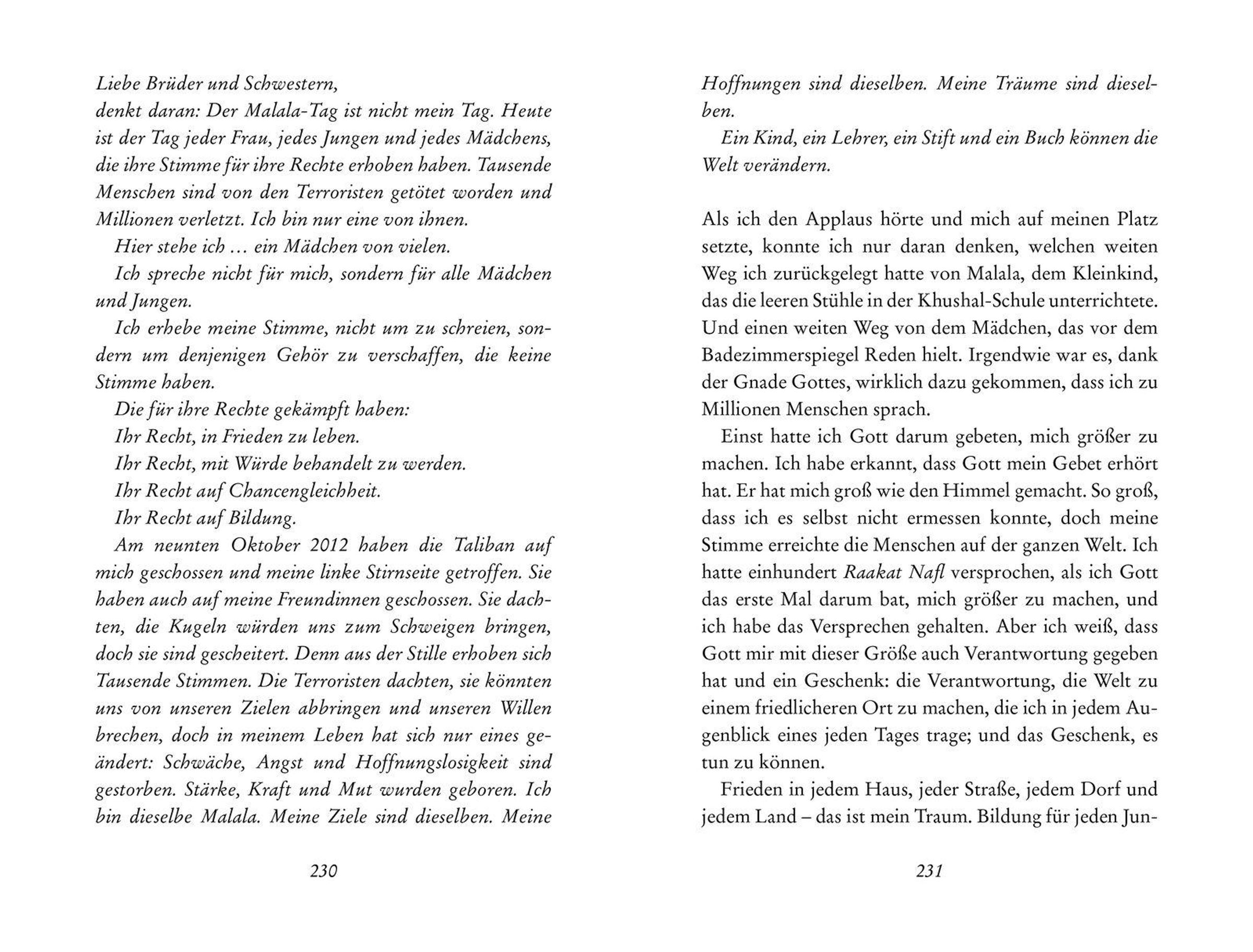 Sie setzt ihren Kampf für Bildung unermüdlich fort und ist damit zum Vorbild vieler Jugendlicher auf der ganzen Welt geworden. In einer einzigartigen Zusammenarbeit mit Bestsellerautorin Patricia McCormick gelingt es Malala auf höchst bewegende Weise und anhand vieler persönlicher Fotos und Dokumente, ihren jungen Lesern ein authentisches Bild von ihrem Leben und den Ereignissen in Pakistan zu vermitteln. Sie erzählt von ihrer Schulzeit und ihren Freundinnen, davon, wie die Anfeindungen der Extremisten täglich zunahmen, wie sie Widerstand leistete und ihr Leben dadurch eine tragische Wendung nahm. Für ihren Mut und Einsatz erhielt Malala den Friedensnobelpreis.