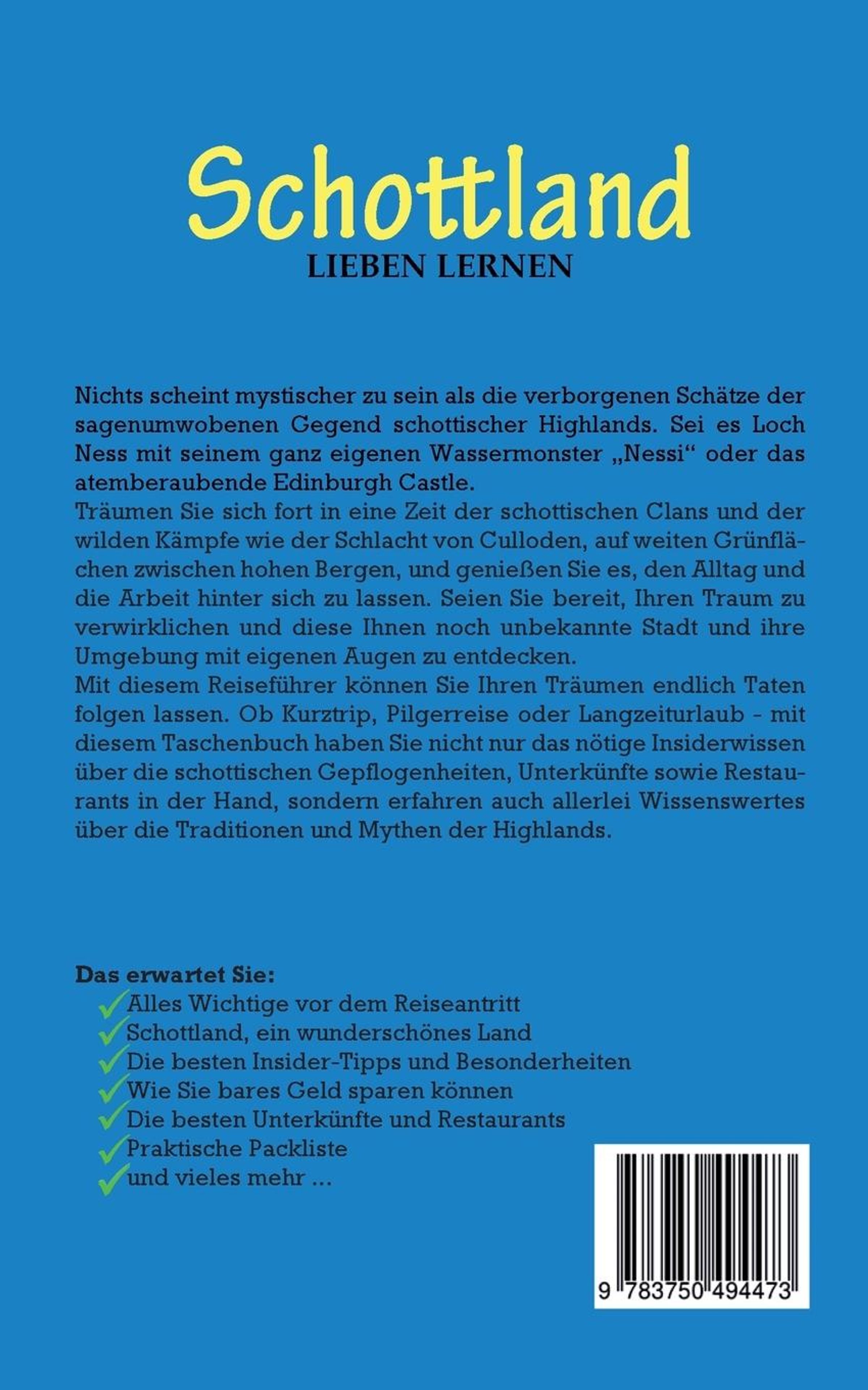 Nichts scheint mystischer zu sein als die verborgenen Schätze der sagenumwobenen Gegend schottischer Highlands. Sei es Loch Ness mit seinem ganz eigenen Wassermonster ,,Nessi'' oder das atemberaubende Edinburgh Castle. Träumen Sie sich fort in eine Zeit der schottischen Clans und der wilden Kämpfe wie der Schlacht von Culloden, auf weiten Grünflächen zwischen hohen Bergen, und genießen Sie es, den Alltag und die Arbeit hinter sich zu lassen. Seien Sie bereit, Ihren Traum zu verwirklichen und diese Ihnen noch unbekannte Stadt und ihre Umgebung mit eigenen Augen zu entdecken. Mit diesem Reiseführer können Sie Ihren Träumen endlich Taten folgen lassen. Ob Kurztrip, Pilgerreise oder Langzeiturlaub - mit diesem Taschenbuch haben Sie nicht nur das nötige Insiderwissen über die schottischen Gepflogenheiten, Unterkünfte sowie Restaurants in der Hand, sondern erfahren auch allerlei Wissenswertes über die Traditionen und Mythen der Highlands.